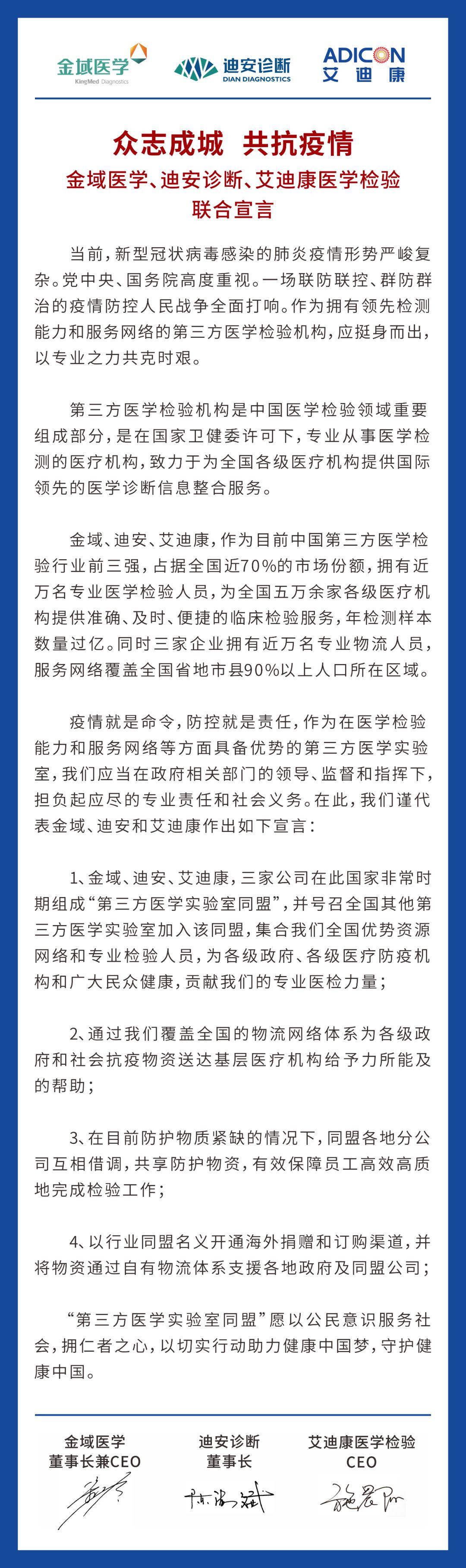 集结号!金域医学、迪安诊断、艾迪康发起联合“战疫”宣言