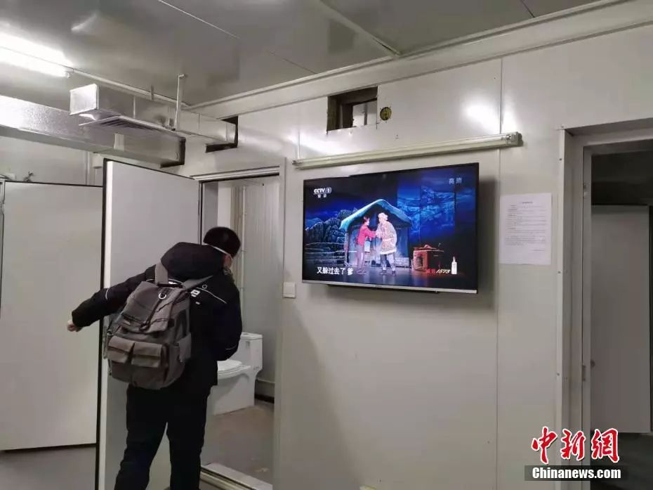 下午2时,记者深入到两层楼的住院楼(U字形大楼)探访,大楼主体结构已经完工,里面正在进行施工。该栋楼共2层,每一层有三条走廊。中间走廊大约有2米宽,两边是病房。记者看到,每两个病房组合一个套房。从内走廊进去,是为医护人员准备的的工作间,然后两边是两个病房,每个病房布置两张病床。每个病房有一个单独的小窗口,还有一个玻璃窗。正对外面走廊也有一个窗户。病房里的空调,窗口设施、消毒设备全部安装到位。每个病房有一个卫生间,每个卫生间都装有热水器。记者在其中一个病房看到,武汉科贝公司正在安装房间的医疗设备,分别是氧气管、负压管和配套设备。该公司现场负责人李经理介绍,到2日下午将全部安装完毕。“这些设备都是一流的。严格按照国际相关标准配备。”