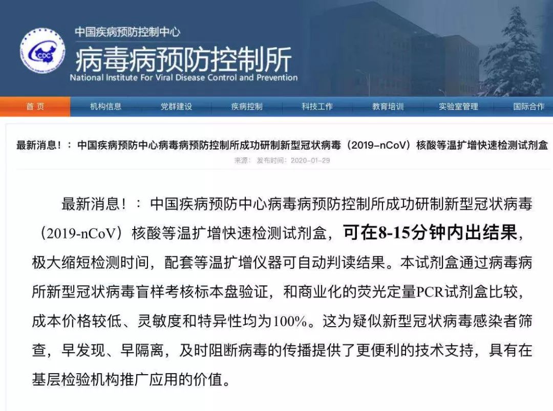然而据《健康时报》报道,中国疾病预防中心病毒病预防控制所官网1月29日发布最新信息显示,其研制新型冠状病毒(2019-nCoV)核酸等温扩增快速检测试剂盒,可在8-15分钟内出结果,极大缩短检测时间,配套等温扩增仪器可自动判读结果。并称其试剂盒通过病毒病所新型冠状病毒盲样考核标本盘验证,和商业化的荧光定量PCR试剂盒比较,成本价格较低、灵敏度和特异性均为100%。 这句“灵敏性和特异性均为100%”投下了一片疑问的阴云,何种技术使其能够突破自然的公理?