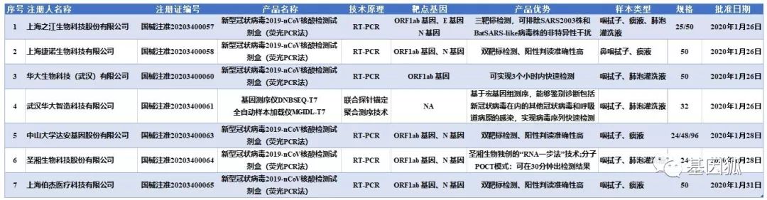 尽管有超过100家企业宣布研制出针对2019-nCoV新型冠状病毒检测试剂盒,但是目前市场上只有7款产品获得了医疗注册许可证,分别来自:之江生物、捷诺生物、华大基因、华大智造、圣湘生物、达安基因和伯杰医疗。产品获证,这意味着该产品通过国家药监部门严格的质量体系考核,其安全性、有效性及质量可控性等获得国家药监部门认定,将全面助力疫情防控。