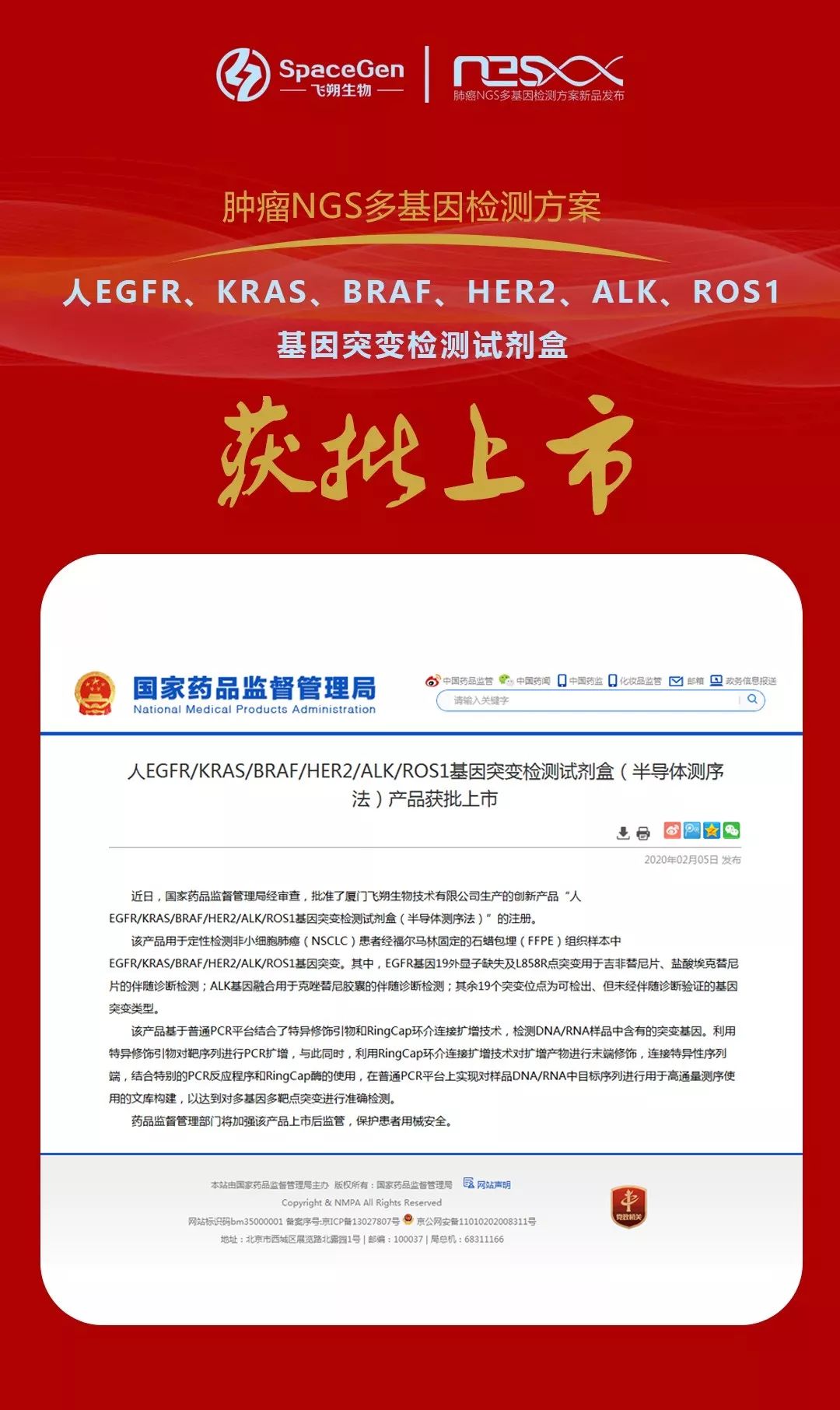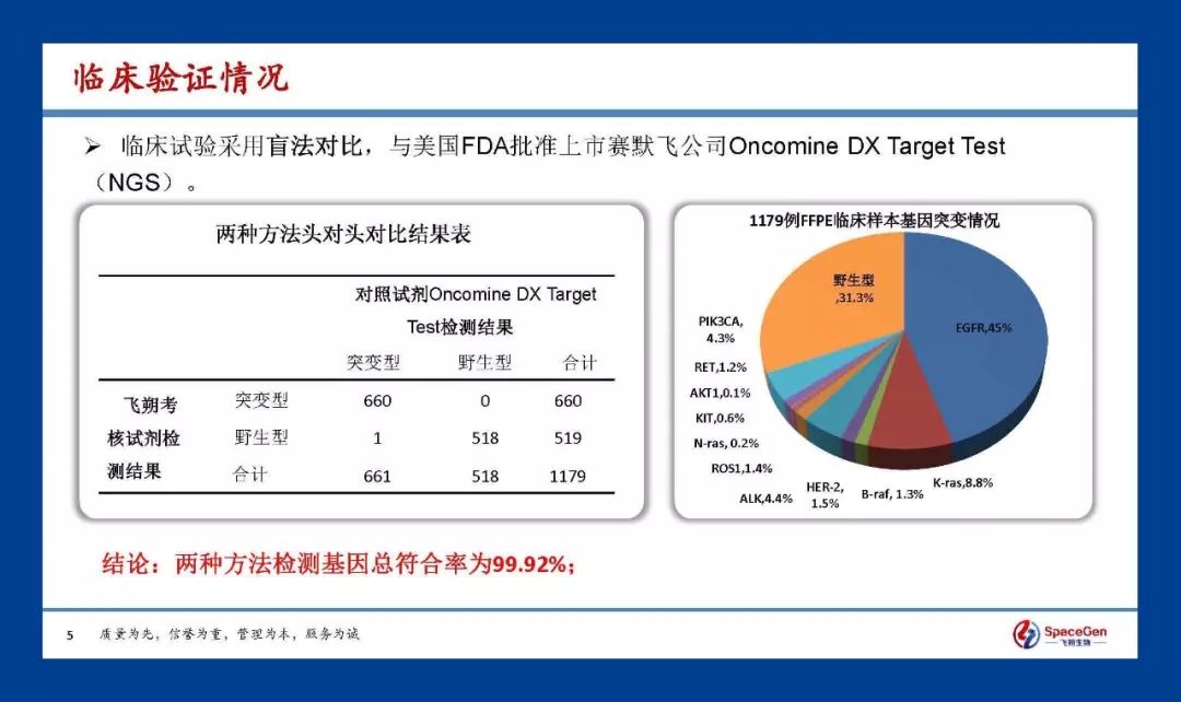 2020年02月05日,由厦门飞朔生物技术有限公司(以下简称“飞朔生物”) 自主研发的肺癌NGS多基因联合检测产品:“人EGFR、KRAS、BRAF、HER2、ALK、ROS1基因突变检测试剂盒(半导体测序法)”获得国家药品监督管理局(NMPA)三类医疗器械注册证,该产品批准用于检测非小细胞肺癌(NSCLC)患者肿瘤组织中与靶向治疗密切相关的13个基因。 在厦门举办的“首届精鉴分子病理新技术新进展高峰论坛”上,飞朔生物隆重举行了肺癌NGS多基因检测方案新品发布,四川大学华西医院步宏教授、北京大学肿瘤研究中心方伟岗教授、哈医大一院病理科戚基萍教授、河北医科大学病理研究室张祥宏教授、浙江大学医学院附属第一医院滕晓东教授、飞朔生物总经理陈琰先生以及副总经理刘蜀闽先生,在启动仪式上倒入金沙,宣布正式启动肺癌NGS多基因检测试剂盒的临床应用,推动NGS技术落地病理科,加速院内规范化开展NGS技术的临床使用,为广大肺癌患者实行精准的诊断和治疗提供有力工具,参加高峰论坛的近百名国内病理领域知名专家学者共同见证了这一重要的时刻。 ▲ 刘蜀闽、陈琰、戚基萍、方伟岗、步宏、张祥宏、滕晓东 据悉,此次获批的飞朔生物肺癌NGS多基因检测试剂盒是基于其自主知识产权的RingCap®核心技术平台的创新产品,具有操作简便、快速、准确,最快1.5个工作日即可出报告,可对相关基因的突变、插入、缺失、基因融合等多种变异形式进行全面地检测,其中针对基因融合变异是基于RNA水平的NGS检测方法。NCCN Guidelines Version 1.2020 Non-Small Cell Lung Cancer中特别针对基因融合变异的检测,强烈推荐选择基于RNA水平的NGS检测方法,以提高检测准确性。涵盖最新NCCN指南中推荐的肺癌所有核心基因的全部敏感性和耐药性变异位点,帮助患者和临床医生筛选最佳的治疗方案。 该产品在申请国家药品监督管理局(NMPA)三类医疗器械注册证的临床试验中采用与美国FDA批准上市赛默飞公司Oncomine DX Target Test(NGS)头对头双盲比较。赛默飞的Oncomine DX Target Test(NGS)是美国FDA批准的全球第一个NGS伴随诊断试剂。上千例临床真实样本的对比结果显示两种方法检测总符合率为99.92%。 日前在厦门举办的“首届精鉴分子病理新技术新进展高峰论坛”在厦门五缘湾水乡酒店隆重举行,基金会理事长步宏教授、方伟岗副理事长、陈刚秘书长等近百名国内病理学知名专家齐聚一堂共同参加了本次论坛,就分子病理的过去、现在和未来、精准医疗背景下分子病理规范化建设、分子病理新技术如何助力病理转化研究进行了学术交流。 ▲ 高峰论坛大合照 ▲ 开幕式 ▲ 基金会理事长步宏教授 论坛在厦门五缘湾水乡酒店举行了隆重的开幕式。基金会理事长步宏教授致开幕式欢迎辞,向病理学同仁呼吁,在分子病理飞速发展的今天,既要发挥传统病理技术的最大功用,也要不断接纳和学习新的技术,病理学才能持续稳定地发展,更好地服务于临床和病人。 由四川大学华西医院病理研究室主任、基金会理事长步宏教授主持,就分子病理的过去、现在和未来的热点问题进行了讲述和讨论,内容包括肿瘤分子病理检测的新技术、最新进展、研究热点与发展趋势等,来自河北医科大学病理研究室张祥宏教授、复旦大学上海医学院病理学朱虹光教授、浙江大学医学院附属第一医院滕晓东教授、北京大学临床研究所方伟岗教授与大家共同展开研讨,NGS等新技术的快速发展和政策的成熟正推动着病理学科加速变革,进入精准医疗时代,每一位病理人要重视和加快病理学科发展建设,特别是分子病理的临床应用,为广大的患者带来福音,促进病理学科发展。 ▲ 专家演讲课题㈠ ▲ 分子病理的过去、现在和未来 ▲ 课题讨论 肿瘤精准治疗依赖肿瘤精准诊断,准确的肿瘤分子病理诊断及分子病理检测是肿瘤精准化诊疗路径中的决定性环节,随着肿瘤分子病理检测临床需求的进一步扩大,对分子病理新技术应用及检测标准化、规范化提出了更高的要求。随后,由哈医大一院病理科戚基萍教授主持,以及来自福建省肿瘤医院病理科陈刚教授、西安交通大学第一附属医院病理科张冠军教授、苏州大学附属第一医院病理科郭临川教授、中国科学院大学附属肿瘤医院病理科孙文勇教授以“精准医疗背景下分子病理的规范化建设”为主题,与论坛专家们就精准医疗环境下病理科分子病理学发展面临的挑战展开激烈的讨论与交流,专家们一致认为应当努力寻求一种适合我国现状的分子病理学科学发展模式,同时加强分子病理学检测能力规范化建设,满足精准医疗环境下临床对分子病理学检测的需求。 ▲ 专家演讲课题㈡ ▲ 精准医疗背景下分子病理的规范化建设 ▲ 课题讨论 随着分子病理学的不断发展与进步,分子病理诊断的技术迭代和应用拓展正迎来新的阶段,分子技术给病理这个现代医学的基础学科不断带来勃勃生机与不竭动力。分子病理新技术如何助力病理转化研究就成了病理学专家们共同关注的的课题,在宁夏医科大学总医院病理科韩恩善教授的主持下,中日友好医院病理科钟定荣教授、中南大学湘雅医院病理系周建华教授、南京医科大学第一附属医院张智弘教授、解放军第940医院病理中心刘斌教授、天津医科大学肿瘤医院病理科孟斌教授,紧扣分子病理新技术发如何助力病理转化研究,分子病理领域热门研究分析、分子病理