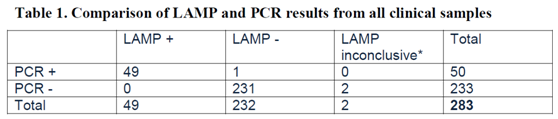 Guangxiang Wang等人的研究表明在羊的口疮病毒检测中,LAMP正确识别出46只阳性中的41只(89.13%); qPCR (real-time PCR)正确识别出了46只阳性中的42只(91.30%) [2]。