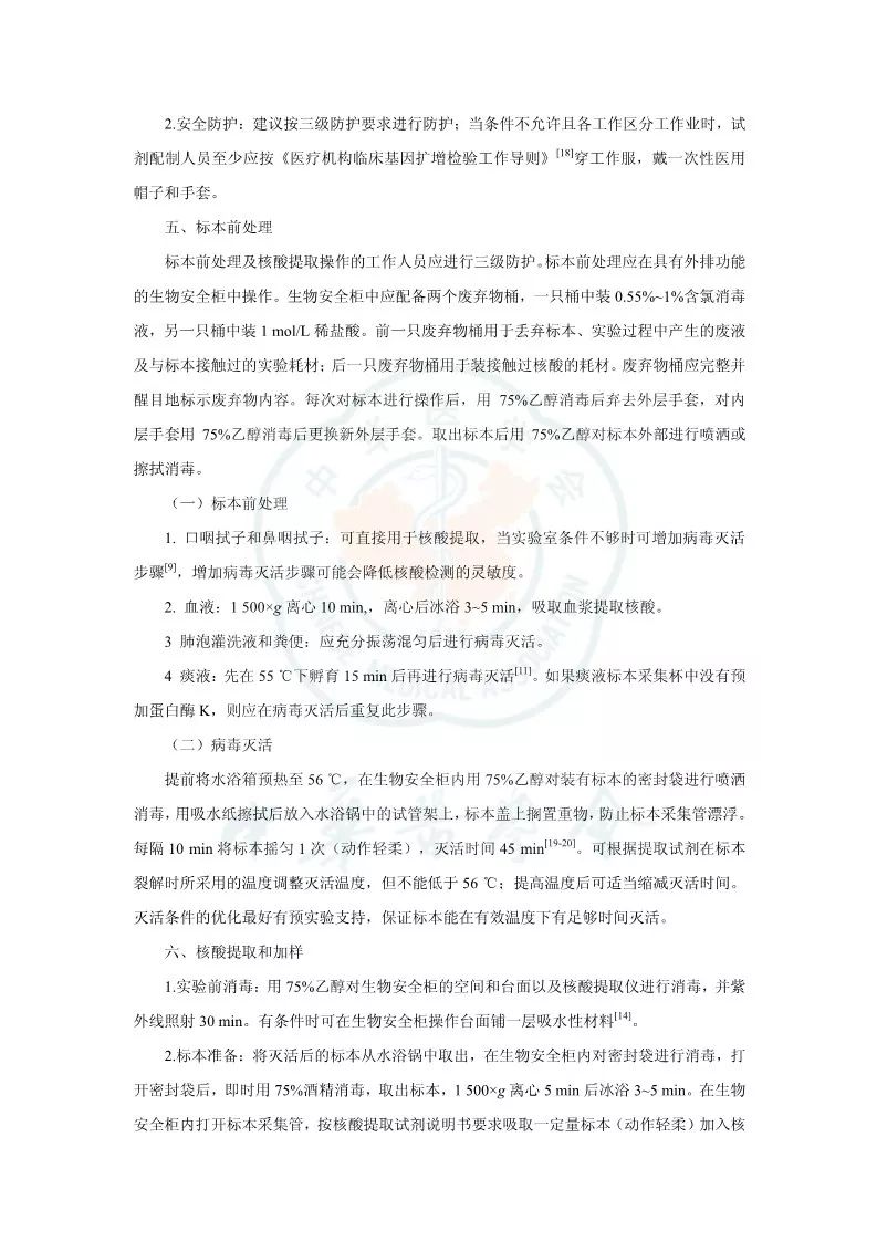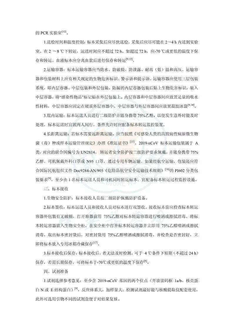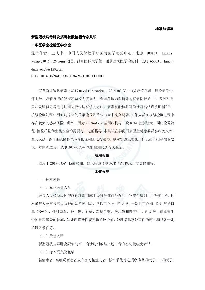 突发新型冠状病毒(2019 novel coronavirus,2019-nCoV)肺炎疫情以来,感染病例快速上升。随着疫情的发展和防控力度加大,全国各地乃至境外均有病例报道,及时对急重症及疑似患者进行诊断需要快速有效的方法,病毒核酸检测可为诊断提供直接证据。核酸检测过程中因对病原体的传染途径和致病力尚未完全明确,工作人员在核酸检测过程中存在较大的感染风险。此外,因为 2019-nCoV 基因结构与一般 RNA 差别较大,因此检验流程、检验质量和生物安全均需要有一定的指导。本共识在参阅国家卫生健康委员会相关文件、查阅文献、咨询重疫区相关专家的基础上进行编写,以对实验室检测工作提出有指导性的建议,本共识适用于从事 2019-nCoV 核酸检测(如RT-PCR方法)的所有实验室。 参考资料: |
