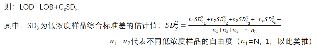 2.1 检出限LOD的确定:在确定LOD时,样品检测的标准差最好来自多个低浓度样品的检测,样品的浓度范围在1LOB至4LOB之间,建议至少不低于60个重复测定结果,最好取4~6个低浓度样品,计算这些水平下精密度的综合估计值,如果多个低浓度样品Cochran检验一致。