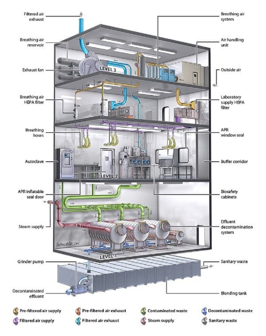 新型冠状病毒的快速传播将病毒又一次带入人们的视线,不光医务和救援工作者在前线全力救治,科研人员也在紧锣密鼓地进行病毒研究以及药物实验。 那你可能想知道,进行病毒实验的实验室是什么样子?与学校里的生物实验室、医院里的检测实验室有什么不同呢?接下来,让我们一起认识一下生物安全实验室。 什么是生物安全实验室? 实验室是进行科研工作的必需场所,根据危险度等级,包括传染病原的传染性和危害性,国际上将生物实验室按照生物安全水平(Biosafety level,BSL)分为P1(Protection level 1),P2,P3和P4四个等级。 P1-P4实验室可以承担的工作也根据安全等级进行划分,其严格等级从低到高。 P1实验室:基础实验室,适合对人体、动植物或环境危害较低,不具有对健康成人,动植物致病的因子。 P2实验室:基础实验室,适用于对人体、动植物或环境具有中等危害或具有潜在危险的致病因子,对健康成人、动物和环境不会造成严重危害,有有效的预防和治疗措施。 P3实验室:防护实验室,适用于处理对人体、动植物或环境具有高度危害性,通过直接接触或气溶胶使人传染上严重甚至是致命的疾病,或对动植物和环境具有高度危害的致病因子,通常有预防和治疗措施。 P4实验室:最高级别防护实验室,适用于对人体、动植物或环境具有高度危害性,通过气溶胶途径传播或传播途径不明,或未知的、高度危险的致病因子。没有预防和治疗措施。比如埃博拉病毒。 生物安全实验室的建设需要遵照已发布的《生物安全实验室建筑技术规范》。根据规范,P2实验室宜实施一级屏障和二级屏障,而P3和P4实验室需要设置一级屏障和二级屏障。 一级屏障保障了实验操作者与被操作对象之间的隔离,包括生物安全柜和正压防护服等;二级屏障则是保障了生物安全实验室与外部环境的隔离,其中就包括换气系统,因此,一级屏障和二级屏障分别是实验人员和外界环境的保护伞。建筑技术规范中也详细制定了P3和P4等级实验室的主要房间,包括主实验室,主实验室缓冲间,隔离走廊,防护服更换间,准备间,淋浴区等的技术指标。超高的清洁级别,恒定范围的温度、湿度以及压差都是实验安全的保证。 生物安全实验室二级屏障的主要技术指标 来源: 生物安全实验室建筑技术规范 GB 50346-2011 你可能会好奇,最高级别的P4实验室具体是怎样的呢? P4实验室作为最高级别的生物安全实验室,是应对高危险性、且无法预防和治疗的烈性病毒的利器。P4实验室一般为一栋独立的建筑物,如与其他级别生物实验室共用建筑物,也需要在建筑物中占据独立的隔离区域,并与附近的其他建筑物完全隔离。在常见的四层结构中,一层为污水处理与保障设备,二层为核心实验区,三层为排风管道过滤层,四层为空调设备与送排风管道。 P4实验室的基本特征 来源:National Institutes of Health, part of the United States Department of Health and Human Services 生物安全实验室中的人员保护 进入普通实验室时,实验人员仅需实验服,手套和面部防护等装备。而高等级实验中有潜在的危险致病因子,研究人员要怎样保护自身呢?