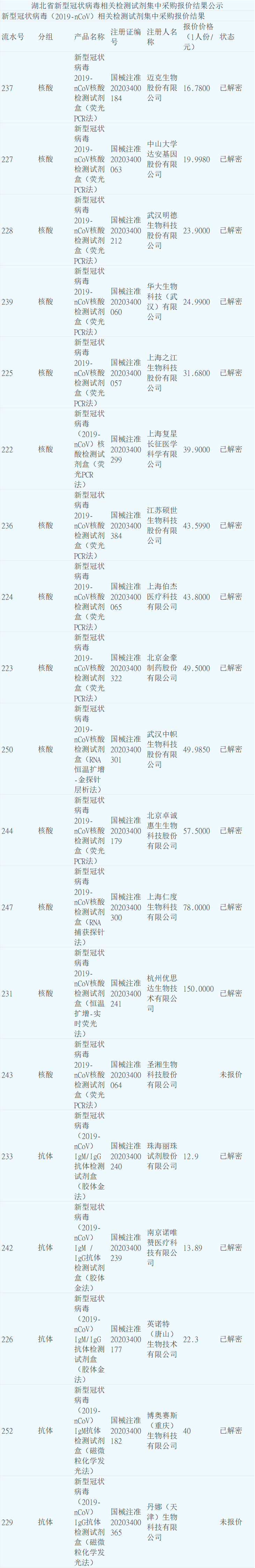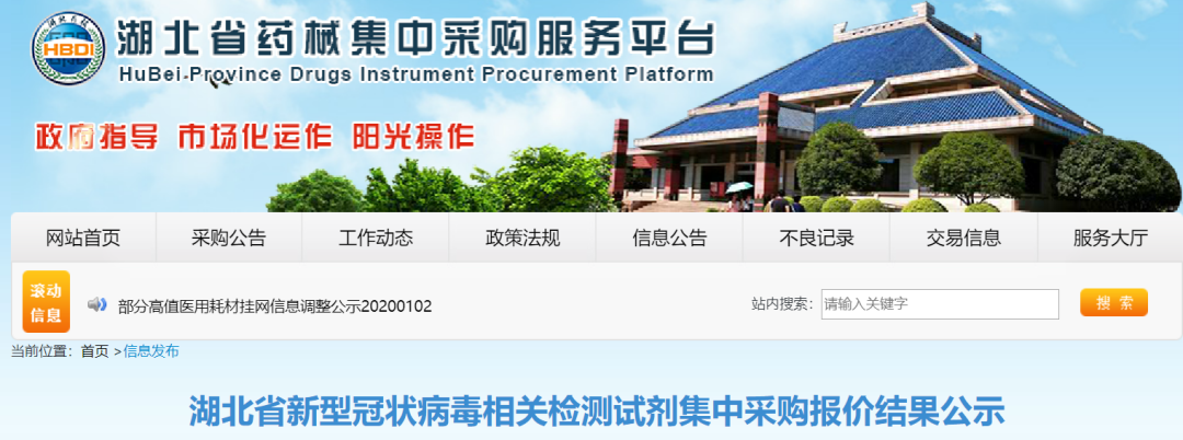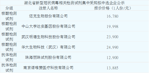 湖北省新型冠状病毒相关检测试剂集中采购报价结果公示:
