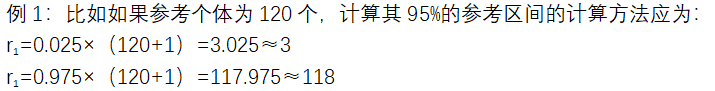 用n代表参考值的数量,首先将观测值按大小顺序排秩,用r代表观测值的秩(最小的秩为1,最大的秩为r=n)。用非参数方法估计参考限的上限和下限。下限的秩用r1表示,上限的秩用r2表示,则参考区间r1~ r2。为其中r1 r2通常不是整数,因此,常用插入法计算秩。为方便理解,下面针对常用的计算方法,进行举例说明。