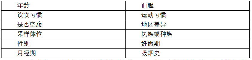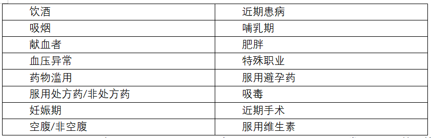 2.1排除标准:在选择参考个体时应按照项目的临床使用目的设计排除标准,排除标准应尽可能的详细,将非参考个体排除在参考样本组之外。不同的参考值研究可能有不同的标准,下表中列出了常见的排出考虑因素。