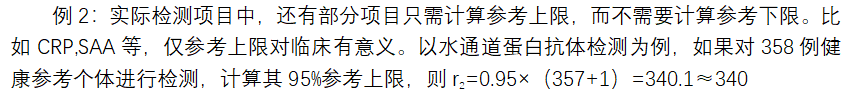 此时此时将357个参考个体观测值从大到小排序,如果第340个参考个体的观测值为2.8u/ml,则其参考范围为≤2.8u/ml。