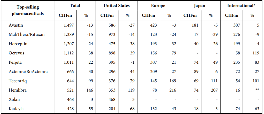 MabThera/Rituxan(利妥昔单抗/美罗华): 营收13.89亿瑞士法郎,同比-15%。日本-39%,欧洲-24%,美国-14。 美罗华于1997年在美国上市,2018年专利到期。目前针对Rituxan有2款生物仿制药,在第一季度获批一款: