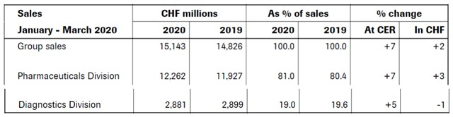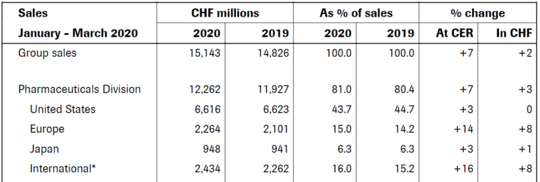 2020年是全球医疗行业的分水岭,潜藏在新冠疫情的背后,是更大的经济、商业危机。丘吉尔有句话:“千万不要放过一次危机! 逆境之中,罗氏用行动告诉我们:萧条下的局部繁荣是真的可以持续。 ▲2020年Q1罗氏营收 4月22日,罗氏发布2020年第一季度财报,本年度迎来了开门红:集团全球营收151.43亿瑞郎(156.28亿美元),同比+2%。其中
