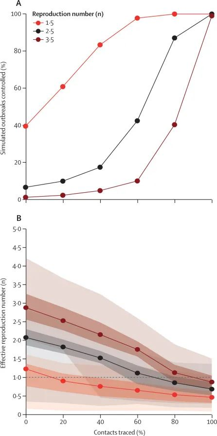 控制疫情的定义为,在最初病例后的12至16周内没有新的感染。研究人员建立并实施了一个分支过程模型,以5、20或40个案例初始化了分支过程,以代表新近检测到的规模不同的爆发。其中每个个体产生的潜在继发病例数均取自负二项分布,均值等于繁殖数(R0),并且每个个体产生的新感染数具有异质性。每个潜在病例的感染时间从连续间隔分布中得出,只有当感染者尚未被隔离时才创建继发病例。
