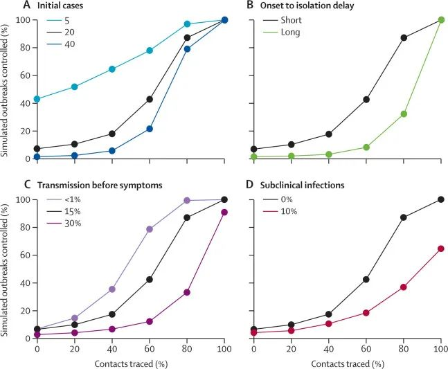 在控制疫情爆发方面,从症状发作到隔离的延迟起着非常关键的作用。如果延迟时间很长,即使追踪到了80%的接触者,控制疫情的概率也会从89%下降到31%。在测试的所有R0和隔离延迟分布下,较高的症状前传播降低了疫情被控制的可能性。