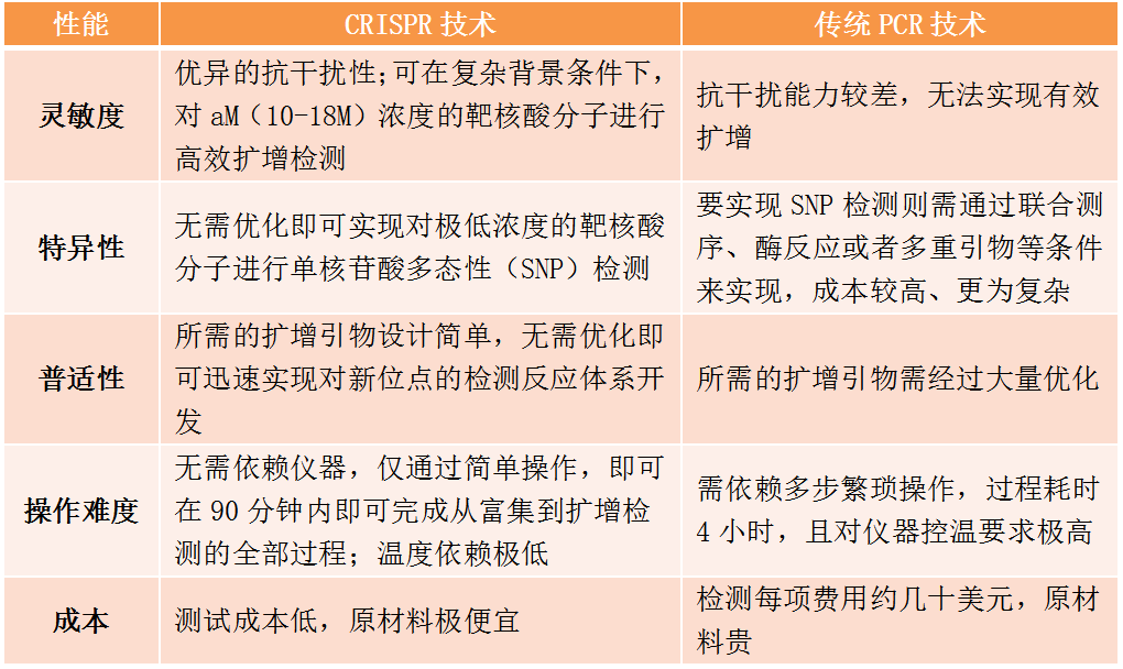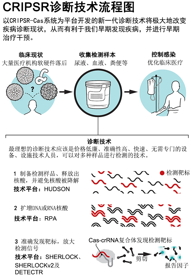 壹 CRISPR体外诊断技术概况 1、CRISPR技术的定义 CRISPR的全称是Clustered Regularly Interspaced Short Palindromic Repeats(成簇的规律间隔的短回文重复序列),Cas的全称则是CRISPR associated(CRISPR关联),合在一起简称为CRISPR/Cas系统。Cas9(CRISPRassociated nuclease)是CRISPR相关核酸酶,CCRISPR/Cas9是最一种由RNA指导,利用Cas9核酸酶对靶向基因进行编辑的技术。该技术是被人们发现并加以利用,而非为人类开发合成的。 CRISPR/Cas9成功与否的关键在于gRNA的设计,gRNA和非目标区域过多的非特异性结果,脱靶效率较高,特别是靠近PAM的8-10bp不能和非目的区有高同源性。目前为了提高基因组编辑的准确性,对Cas9核酸酶进行了突变,突变后的Cas9只能切割DNA双链中的一条链,通过两个gRNA引导Cas9对DNA切割,可以显著提高基因组编辑的特异性,降低脱靶效应。 2、CRISPR技术原理 CRISPR/Cas9主要由两部分组成:gRNA和Cas9蛋白。gRNA由CRISPR RNA(crRNA)与反式激活crRNA(trans-activating crRNA,tracrRNA)组成,crRNA的一部分序列能与tracrRNA配对,形成双链RNA结构;一部分序列与靶目标互补区域,以此识别靶序列。Cas9蛋白先与gRNA形成复合体(Cas9-sgRNA),使Cas9蛋白构象变化,产生一条通道,使其更容易与DNA结合。该复合体随机碰撞DNA,若未识别到PAM序列,则会快速离开DNA,发生下一次碰撞;若识别PAM序列,Cas9蛋白的Arg1333和Arg1335会与二核苷酸鸟嘌呤结合,此时,Ser1109和Lsy1107形成磷酸锁结构,与PAM序列旁的+1位核苷酸发生相互作用,促使双链DNA解旋,利用RNA-DNA碱基互补配对原则,核对序列与crRNA的互补情况,若在种子序列出现较多错配,则序列识别过程终止,从而确保Cas9在正确的目标处发挥作用。 从原理上来说,CRISPR分子诊断方法实际上是将扩增方法与Cas蛋白的检测相结合。CRISPR检测在提高灵敏度的同时,也提高了特异性,而且降低了对仪器依赖。另外,经过方法优化,CRISPR检测也做到了多靶标、一步法定量检测、DNA和RNA相同步骤检测和适合野外偏远地区的快速分子检测。 3、CRISPR体外诊断技术发展历史 CRISPR技术是在20世纪90年代初发现的,并在7年后首次用于生物化学实验,迅速成为人类生物学、农业和微生物学等领域最流行的基因编辑工具。 在2015年初,中国科学院深圳先进技术研究院周文华团队提出:CRISPR体系在分子诊断领域将有巨大的应用前景和优势,其因此也作为世界范围内最早提出这一设想的课题组之一。 但CRISPR体外诊断技术的发展不得不追溯到加州大学(伯克利)的Jennifer Doudna博士、麻省理工张锋博士,二者不但在CRISPR诊断技术的发明、应用上做出奠基性的贡献,还积极致力于该技术的产业化和商业化。 2016年8月张锋团队在Science期刊上发表了的一篇关于一种新CRISPR核酸酶的文章C2C2(即俗称的Cas13a)。他们意外发现Cas13a在完成特异性切割RNA之后,能够非特异性的切割任意的单链RNA,Cas13a具有强烈的细胞毒性。 就在张锋进行Cas13a的研究的同时,UC-Berkeley大学的Doudna团队也在进行相同的研究。于同年10在月Nature上发表研究结果——Cas13a非特异性切割RNA能够用于核酸的分子检测。 此后,张锋团队加速了Cas13a在核酸检测上的研究,于2017年4月在Science期刊上发表研究成果——一个基于CRISPR/Cas13a的分子诊断技术(简称SHERLOCK)。 2018年2月,Doudna团队在Science期刊上发表研究成果——除Cas13a具有非特异性切割RNA的功能,Cas12a与Cas13a具有相似的特性,在特异性的切割目的DNA之后,能够非特异性的切割单链DNA。并基于此发明了基于Cas12a的分子诊断技术(简称DETECTR)。原理同Cas13a一样,不过用于发光的底物是单链DNA。 2018年4月,中国科学院上海生命科学研究院王金团队在Cell Discovery期刊上发表了基于Cas12a的分子诊断技术。 2018年9月,中国科学院深圳先进技术研究院周文华团队在Nature Communications期刊上发表了研究成果——利用CRISPR系统效应蛋白Cas9在与靶核酸分子结合过程中独特的构象变化,高效启动针对靶核酸分子指数倍扩增的分子诊断技术(简称CRISDA)。 2018年10月,Jennifer Doudna团队LucasHarrington发现Cas14a的切割对象是单链DNA,而不是双链DNA,因而Cas14a可用在DETECTR诊断工具中。Cas12a擅长识别双链DNA,Cas13a擅长识别单链RNA,Cas14a擅长识别单链DNA,因而RNA、双链DNA和单链DNA都可以检测。通过比较Cas12a和Cas14a检测单核苷酸多态性(SNP)的能力,发现Cas14a的特异性增加可实现高保真的SNP基因分型。 4、CRISPR诊断技术优势 同其它基因编辑技术相比,CRISPR有很多优势:灵活性(对不同的基因靶点只需改变gRNA序列)、高特异性、便捷性、可模块化、可编程、低成本等等,因此该技术正在医疗、农业和工业等多个领域被广泛开发。在医疗领域中,CRISPR技术的应用也主要有三个方向:治疗、科研工具、体外诊断(IVD)。 在体外诊断领域中,CRISPR技术在诸多方面均优于传统PCR技术: 5、CRISPR体外诊断技术应用领域 就CRISPR技术在IVD领域来看:CRISPR诊断特异性极好,可以检测到一个碱基的突变,非常适合早期筛查肿瘤、检测肿瘤易感基因和致病基因; 同时,CRISPR诊断技术操作简单、对仪器设备依赖性低、价格低廉,适合野外检测和不发达地区检测;例如国内某兽医科研单位基于CRISPR建立适合养殖场净化的诊断方法,刚果民主共和国利用CRISPR分子诊断技术检测埃博拉病毒(Ebola virus); |