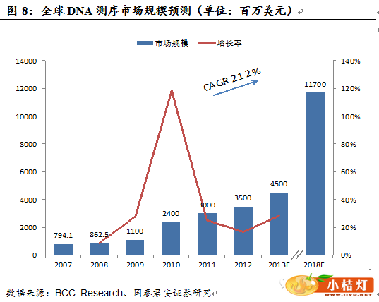 2. 基因测序产业链分析 2.1. 全景——增长迅速,分工明确 基因测序(DNA测序)产业近些年得到迅猛发展。尤其是新一代测序技术诞生以来,全球基因测序市场总量从2007年的794.1万美元增长至2013年的45亿美元,预计未来几年全球市场仍将继续保持快速增长,2018年达到117亿美元,CAGR21.2%(数据来自BBC research)。