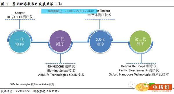基因测序产业链全景:中国企业在中游测序服务最具优势。基因测序已经形成明确的产业链分工:①上游为设备和耗材供应商,Illumina等少数外资凭借技术垄断市场;②中游为第三方测序服务供应商,需依赖设备投入、运营管理与终端维护开发,是目前中国企业最具优势的一环;③下游为生物信息分析服务商,现处于起步阶段,由于数据分析的技术瓶颈日益突显,待发掘的市场潜力最大。 国内市场格局:生育健康应用面临重整。目前测序服务主要面向科研市场,壁垒低,小企业增长迅速,竞争较为激烈;而医疗市场生育健康领域应用相对成熟,但前期规范监管不足,经历整顿后正处于试点探索阶段,未来增长有望恢复;个体化治疗与健康信息管理将随基础医学发展及生物信息大数据分析的技术进步开启一片新的市场。相对成熟的产前无创筛查市场,在国内暂停基因检测之前,主要被华大基因和贝瑞和康所瓜分,2014年3月CFDA开发申请后,申报企业数量众多,我们认为市场存在再分配的机会。市场准入许可、成本控制和渠道管理将成为市场角力的关键,市场需经历大浪淘沙的过程。 行业前景广阔,但相关公司发展前景不确定性较高,过程相对漫长。基因测序行业布局最早的华大基因,贝瑞和康等均未上市,而国内相关上市公司均处于业务培育或研发的早期阶段,发展前景不确定性较大:①达安基因参股17%的爱健生物与美国Life Technologies公司合作,已能独立开展基于二代测序的无创产前基因检测等服务,虽综合配套管理能否跟进需要进一步观察。考虑到公司是与技术相对成熟的外企合作,且自身的诊断业务已有医院渠道和自有独立医学实验室,未来或有业务协同的效应,有望在快速增长的测序市场中获得一定的份额。②千山药机控股52.57%的宏灏基因已有基因芯片批文,但二代测序业务尚未开展。③紫鑫药业与中科院合作开发测序仪,仍在样机试验阶段,需要经历较长的探索期。 风险提示:试点批准进度慢于预期,基因测序引起伦理及道德问题。 正文: 1. 基因测序产业革命新浪潮 1.1. 测序技术的发展历程 基因测序,也称DNA测序,是现代生物学研究中重要的手段之一,自上世纪70年代一代测序技术问世以来,经过三十几年的发展,基因测序技术已经过了三个发展阶段: 第一代DNA测序技术是1975年由桑格(Sanger)和考尔森(Coulson)提出的经典的链终止法。90年代中期发明了第一台基于此法的全自动DNA测序仪,并采用荧光染料代替同位素标记,用集束化的毛细管电泳代替凝胶电泳,通过计算机进行图象识别,由应用生物系统公司(AppliedBiosystems Inc.)(后与Invitrogen合并为Life Technologies公司)推上市场。第一代技术准确率高,读取长,是至今唯一可以进行“从头至尾”测序的方法,新的测序技术仍然依赖于Sanger技术的协助作用,但其存在成本高、速度慢等方面的不足,并不是最理想的测序方法。使用第一代Sanger测序技术完成的人类基因组计划,花费了30亿美元巨资,用了十三年的时间。 随后产生的二、三代测序技术以高通量为共同特征,也被称为“新一代测序技术NextGeneration Sequencing(NGS)”。以Roche公司的454测序平台,Illumina公司的Solexa测序系统以及ABI公司的SOLID测序系统标志着第二代测序技术诞生。这种“大规模平行测序”,主要基于连接测序(Solid技术),或者合成测序(454和Solexa技术)。这些方法与第一代测序技术比较增加了通量,尽管各系统在高通量水平、测序准确度、存储格式、技术方法上各有差异,但共同特征是大大降低了测序成本并极大地提高了测序速度,完成一个人的基因组测序现在只需要一周左右的时间。然而第二代测序技术在测序前要通过PCR手段对待测片段进行扩增,增加了测序的错误率。而且二代测序产生的测序结果长度较短,需要对测序结果进行人工拼接,因此比较适合于对已知序列的基因组进行重新测序,而在对全新的基因组进行测序时还需要结合第一代测序技术。 Life Technologies公司的半导体测序仪Ion Torrent在半导体芯片的微孔中固定DNA,不需激光、照相或标记,成本低速度快,被认为是2.5代测序技术。 近期出现的Helicos公司的Heliscope单分子测序仪、PacificBiosciences公司的SMRT技术、和Oxford Nanopore Technologies公司正在研究的纳米孔单分子技术,被认为是第三代测序技术。与前两代技术相比,他们最大的特点是单分子测序。第三代测序技术解决了错误率的问题,通过增加荧光的信号强度及提高仪器的灵敏度等方法,使测序不再需要PCR扩增这个环节,实现了单分子测序并继承了高通量测序(High Trough-outSequencing)的优点。