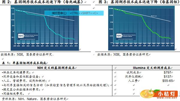 1.2. 测序成本不断降低 新一代测序技术可以一次性检测大量基因,并且速度更快,成本更低。根据NIH的统计,自2001年起尤其是2006年新一代测序技术推出以来,DNA测序成本以超“摩尔定律”的速度不断降低,从每个基因组1亿美元下降到2013年的5000美元。2014年 Illumina 宣布其新产品 HiSeq X Ten可以实现单基因组测序成本降到1000美元以下。尽管其计算方法与NIH的成本定义有所差异,但它预示着测序成本不断降低的趋势仍会继续。这将使得生命科学领域的研究可以进行广泛的实验,另一方面令个人基因组信息大范围受用于普通人的设想越来越成为可能。