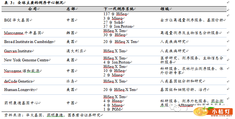 2.3. 第三方测序服务——中国成为全球“测序工厂” 根据2010年绘制的高通量测序平台分布地图,中国拥有量仅次于美国,如今二者的差距很可能已经非常小。全世界规模最大的基因组研究中心有多个在中国,其中华大基因(BGI)拥有世界上最多的新一代测序仪,产能约占全球的10%-20%(按illumina,Life等销总量计算)。由于测序服务技术壁垒较低,而且主要面向科研市场,国家缺乏准入标准和质量控制规范,众多碎片化的小企业呈现疯狂生长的状态,仅提供一代测序服务的企业就有上百家。