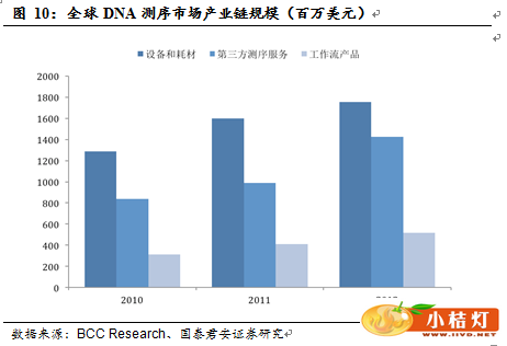 从市场规模和增长情况来看,设备和耗材市场仍是产业链最大的一环,但测序服务的增速最为迅猛,以生物信息分析为主的工作流产品,基数小,上升空间大。