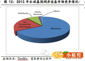 2.2. 上游设备与耗材——寡头技术垄断 目前市场上主流新一代测序平台主要由美国Illumina、Ion Torrent/Life Technologies (2014年被Thermo Fisher收购)、454 Life Sciences/Roche、 PacificBiosciences这四大生产商制造。 Illumina是一家致力于开发、生产和销售大规模基因组学分析集成系统的公司,它已经成长为基因测序行业的巨头,占据了全球设备市场三分之二的市场份额,其生产的下一代高通量测序仪HiSeq系列一直是市场上最为畅销的产品。另一方面,Life Technoloiges凭借小巧轻便的台式测序仪Ion PGM和Ion Proton也分割了20%以上的市场份额。而Roche曾收购454 成为第一个进入高通量测序市场的公司,近几年却因新产品匮乏导致市场份额不断收缩。
