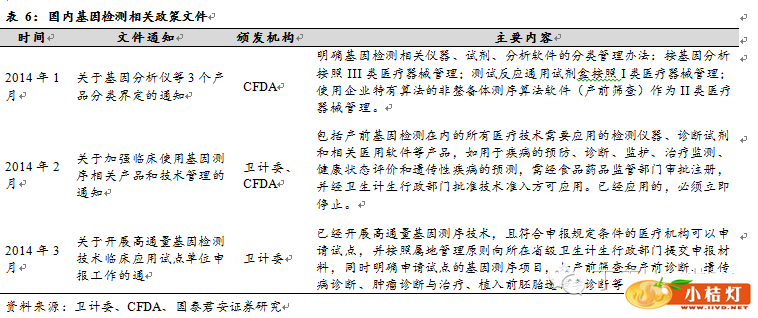 4. 行业总结及相关上市公司 新一代测序技术的飞跃式发展,检测成本的大幅下降,为其商业化应用奠定了技术基础。从产前无创筛查到肿瘤的个性化用药,二代测序技术临床应用范围正逐步拓宽,并快速革新传统的治疗与健康管理方式,孕育巨大的市场空间。 监管规范与基础生物信息学仍是目前制约新一代测序技术应用的主要瓶颈。监管与规范化问题有望随着试点审批以及相关注册法规完善逐步而解决,技术相对成熟的生育健康领域将最先恢复发展,重回快速增长的轨道。 生物信息学的发展,关于人类健康与基因关系的研究过程相对漫长,有赖于大数据等新技术的应用的支持,但对每一个病种或者每一个基因研究的突破都将打开一片新的市场空间。当大量生物信息大数据被解读,基因测序市场将与疾病预防相结合,开启新的技术时代。 巨大的市场前景吸引着大量资本与技术的进入,二代测序企业如雨后春笋般涌现。暂停基因检测之前,产前无创筛查主要被华大基因和贝瑞和康所瓜分,2014年3月CFDA开放申请后,申报企业的数量众多,我们认为市场存在再分配的机会。市场准入许可、成本控制和渠道管理将成为市场角力的关键,新进入企业能否克服后发劣势有望观察。 A股医药上市公司中涉及基因测序研发和业务的公司包括: 达安基因——参股17.14%的爱健生物与美国Life Technologies公司合作,已能独立开展基于二代测序的无创产前基因检测、单基因病检测、乳腺癌基因检测、肿瘤个体化用药基因检测、个人全基因组检测等服务,并与部分医院保持紧密合作,拥有一定技术和渠道先发优势,但综合配套管理能否跟进需要进一步观察。考虑公司是与技术相对成熟的外企合作,且达安自身的诊断业务已有医院渠道和自有独立医学实验室,未来或有业务协同的效应,有望在快速增长的测序市场中获得一定的份额。 千山药机——控股52.57%的宏灏基因已拥有基因芯片批文,但二代测序业务尚未开展,与湘雅等试点医院合作仍未确定。 紫鑫药业——与中国科学院合作开发的二代测序仪,仍在样机试验阶段,其技术水平能否满足实际应用存在较大的不确定,与其合作的医院尚未确定,二代测序业务尚未开展。 5. 风险提示: 基因检测试点批准进度慢于预期; 基因型与疾病关系等基础理论发展落后,制约基因测序应用范围的拓宽; 基因检测的不规范使用代理私隐及伦理问题风险。 来源:国泰君安证券 |