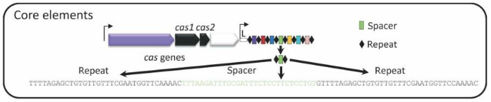 Repeat是细菌固有序列,能够同时结合CRISPR相关性(Cas)蛋白和spacer序列,而spacer则是细菌(或是其祖先)感染过的病毒序列。一旦病毒感染发生,绝大多数的细菌死亡,极少部分的细菌由于其基因变异得以生存。这些细菌中的一部分,将病毒的DNA序列切割后,插入repeat区域中,形成spacer,从而获得类似高等生物“免疫记忆”的能力。当细菌被病毒再次攻击时,这些间隔序列会从整个序列排列中被转录出来,切割成为成熟的crRNA对Cas蛋白的复合物进行引导,切割病毒的核酸分子中的间隔序列前体(protospacer)。