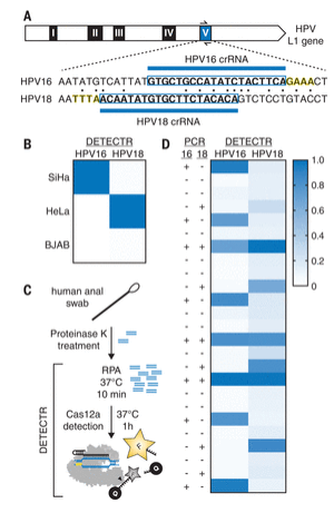 Doudna教授为了分析DETECTR方法的特异性和灵敏度,测试了25种人类肛门拭子的DNA提取物,这些样本先前已通过基于聚合酶链反应(PCR)的方法进行过HPV感染分析。在1小时内,DETECTR准确地鉴定了包含HPV类型异质混合物的患者样品中的HPV16(25/25)和HPV18(23/25),PCR结果与DETECTR荧光信号之间具有良好的相关性。这些结果证明了一种新的基于CRISPR的诊断平台,类似于使用CRISPR-Cas13a用于RNA检测的平台,并表明DETECTR原则上可以以高灵敏度和特异性检测任何DNA序列。