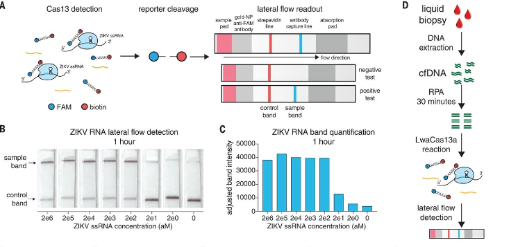 2018年,张锋实验室团队的成果用简单的纸带(paper strip),以展示基因特征(genetic signatures)的测试结果。将纸带浸入处理过的样本后,会出现一条线,指示着目标分子是否被检测到了。通过对CRISPR酶学的表征和应用开发,实现了更快速、更灵敏的检测:1、检测下限低至2 attomolar;2、通过将Cas13与Csm6(一种与CRISPR相关的辅助酶)结合,使信号灵敏度提高3.5倍;3、SHERLOCK v2可以通过侧向层析检测登革热或Zika病毒单链RNA以及患者液体活检样品中的突变,突出了其作为核酸的可复用,便携式,快速和定量检测平台的潜力。