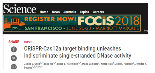 2018年4月,另一个知名团队Jennifer Doudna教授发现Cas12酶家族在gRNA的引导下与目标序列结合以后,便会切换为激活状态切割体系内其它的单链DNA(如含有报告基因的单链底物)。Cas12a这一特点可被用于分子诊断领域,实现对肿瘤基因或特定病原体的检测。Doudna教授将Cas12a靶向切割单链DNA的特性与重组聚合酶扩增RPA技术联合起。当加热到体温时,RPA会快速增加目标DNA的拷贝数,使Cas12a更容易找到并切割它,然后任意切割附近单链DNA,从而让报告分子发出荧光。