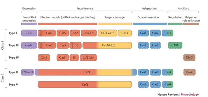 crRNA招募效应蛋白的组成将其分为两级,1级CRISPR系统利用多个Cas蛋白与crRNA形成效应复合物,2级CRISPR系统利用单个大Cas蛋白与crRNA形成效应复合物。