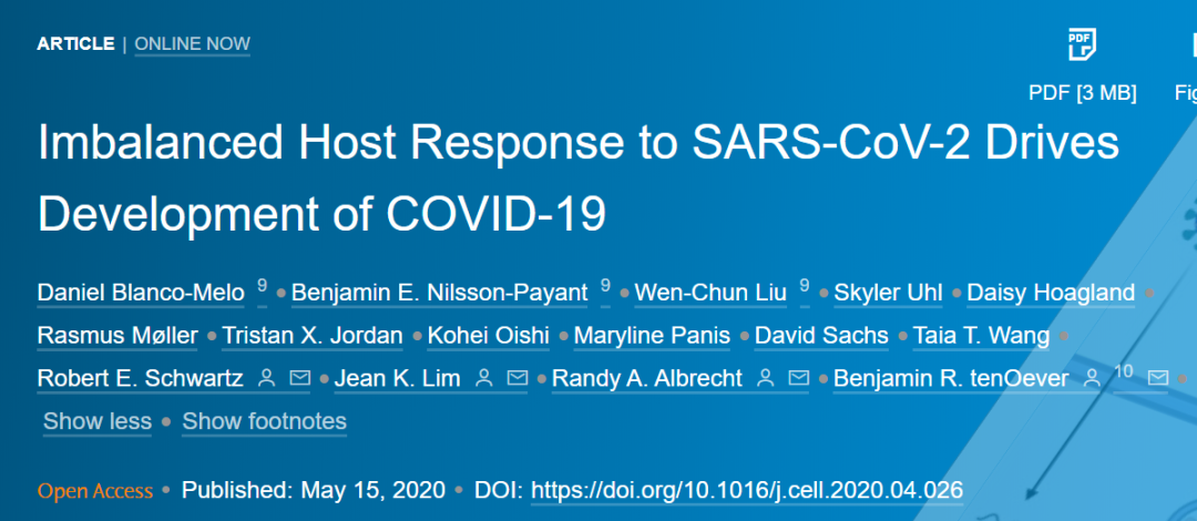 《细胞》上发表的研究的作者表示,由于过激的炎症反应是COVID-19的重要特征,应该聚焦于探索已经获批的抗炎症和免疫调节药物在治疗COVID-19患者的作用。这一思路正在临床试验中接受检验,包括IL-6抑制剂,JAK抑制剂等多种抗炎症药物治疗重症COVID-19患者的疗效目前在多项临床试验中接受评估。而新冠病毒抑制干扰素生成的能力意味着在感染早期使用干扰素可能是防止患者病情恶化的有效策略之一。研究人员在体外实验中已经证明干扰素能够有效抑制新冠病毒的复制。日前在《柳叶刀》上发表的一项临床研究中,中国香港的研究团队发现,早期使用洛匹那韦/利托那韦+利巴韦林+干扰素β-1b的三联疗法,与洛匹那韦/利托那韦相比,显著加快了病毒核酸检测转阴和症状改善,缩短了住院时间。研究人员在报告中指出以干扰素β-1b为基础的双重抗病毒疗法值得进一步研究。在COVID-19疫情爆发初期,阻碍疫情响应的一个重要原因是我们对新冠病毒知道得太少了。随着科学家们对新冠病毒研究的进一步深入,我们期待这些从基础研究中获得的洞见能够转化为更有效的预防和治疗方法。点击文末“阅读全文/Read more”,即可阅读《细胞》上发表的论文全文。 参考资料: [1] Blanco-Melo, et al., (2020). Imbalanced Host Response to SARS-CoV-2 Drives Development of COVID-19. Cell, https://doi.org/10.1016/j.cell.2020.04.026. [2] ‘It’s something I have never seen’: How the Covid-19 virus hijacks cells. Retrieved May 21, 2020, from https://www.statnews.com/2020/05/21/coronavirus-hijacks-cells-in-unique-ways/ [3] Konno et al., (2020). SARS-CoV-2 ORF3b is a potent interferon antagonist whose activity is further increased by a naturally occurring elongation variant. bioRxiv, https://doi.org/10.1101/2020.05.11.088179