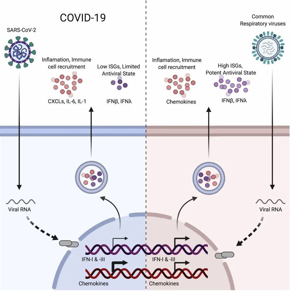 解读这项研究还要从人体对病毒入侵的免疫反应说起。当病毒感染细胞并且在细胞中繁殖时,会触发细胞的预警系统。这些预警系统通过识别在细胞中出现的外来RNA片段,启动免疫系统的细胞免疫应答。细胞的先天免疫应答包括两个部分,第一个部分是分泌干扰素(interferon,IFN),包括I型干扰素(IFN-I)和III型干扰素(IFN-III)。这些细胞因子会刺激一系列干扰素刺激基因(ISGs)的表达。这一信号通路的主要作用是抑制病毒的复制和增生。另一条部分是通过分泌趋化因子,招募身体中其它部位的白细胞增援参加与病毒的战斗。这两个部分可以说是先天免疫系统抗击病毒入侵的组合拳,干扰素在病毒感染初期起到延缓病毒增殖的作用,而趋化因子招集的“后备队”能够帮助彻底消灭病毒。为了对抗免疫系统的防御机制,病毒也进化出了不同的应对方法。很多病毒自身的基因组中,就携带着同时抑制干扰素生成和趋化因子分泌的基因,从而减弱细胞对病毒入侵的免疫反应。而在这项研究中,研究人员发现,新冠病毒在抑制细胞免疫反应方面与众不同,流感病毒和SARS病毒会同时抑制干扰素和趋化因子两条通路,而新冠病毒在抑制干扰素信号通路的同时,并没有抑制趋化因子介导的信号通路。