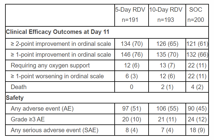 今天,吉利德科学(Gilead Sciences)宣布了其抗病毒药物瑞德西韦(remdesivir),在治疗中度新冠肺炎住院患者时的临床试验结果。在这一开放标签3期临床试验中,5天疗程的瑞德西韦联合标准护理,在接受治疗后第11天,将患者临床改善的可能性提高65%(OR=1.65,95% CI,1.09-2.48,p=0.017)。瑞德西韦10天疗程与标准治疗相比,对临床改善的几率也提供益处,但未达到统计学显著性。该公司计划在未来几周内将全部数据提交到同行评议的期刊上发表。 此前,瑞德西韦治疗严重新冠肺炎的多项3期临床试验数据已经获得发表。这一试验的不同之处是治疗中度新冠肺炎患者,定义为虽然确诊患有新冠肺炎并且住院接受治疗,但是不需要接受机械通气,而且呼吸空气时血氧饱和度大于94%。它们以1:1:1的比例随机接受瑞德西韦5天或10天疗程的治疗,或标准护理。主要终点为在接受治疗后第11天,使用7级评分评估的临床状态。7级评分的范围从出院到增加氧气和通气支持水平,直至死亡。试验结果表明,在接受治疗后第11天,与标准护理组相比,5天疗程治疗组中达到临床状态改善的患者比例显著提高。此外,接受瑞德西韦治疗的患者临床状态恶化或死亡的数目比标准护理组有所减少,但是未达到统计学显著性。