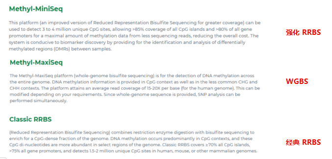 DNA 甲基化是表观遗传学(Epigenetics)的重要组成部分,在维持正常细胞功能、遗传印记、胚胎发育以及人类肿瘤发生中起着重要作用,是目前新的研究热点之一。  DNA甲基化是最早被发现、也是研究最深入的表观遗传调控机制之一。广义上的DNA甲基化是指DNA序列上特定的碱基在DNA甲基转移酶(DNA methyltransferase,DNMT)的催化作用下,以s-腺苷甲硫氨酸(S-adenosyl methionine,SAM)作为甲基供体,通过共价键结合的方式获得一个甲基基团的化学修饰过程。这种DNA甲基化修饰可以发生在胞嘧啶的C-5位、腺嘌呤的N-6位及鸟嘌呤的N-7位等位点。一般研究中所涉及的DNA甲基化主要是指发生在CpG二核苷酸中胞嘧啶上第5位碳原子的甲基化过程,其产物称为5-甲基胞嘧啶(5-mC),是植物、动物等真核生物DNA甲基化的主要形式,也是发现的哺乳动物DNA甲基化的唯一形式。DNA甲基化作为一种相对稳定的修饰状态,在DNA甲基转移酶的作用下,可随DNA的复制过程遗传给新生的子代DNA,是一种重要的表观遗传机制。脊椎动物基因的甲基化状态有三种:持续的低甲基化状态,如管家基因;去甲基化状态,如发育阶段中的一些基因;高度甲基化状态,如女性的一条失活的X染色体。随着高通量测序技术(NGS)技术的发展,使我们能够从全基因组水平来分析5’甲基胞嘧啶及组蛋白修饰等事件,由此能够发现很多传统的基因组学研究所不能发现的东西。5mC是表观遗传最重要的一种修饰,广泛存在于植物、动物等真核生物基因组中, 称誉为“第五碱基”;5hmC是新发现的一种的修饰碱基,称为哺乳动物的“第六碱基”; 从1992年BS作为甲基化的金标准定下来之后,在二代测序未出现之前主要是对于位点检测的焦磷酸测序。2005年二代测序出现后,基于抗体富集方法的MeDIP-seq和经典RRBS出现了,到2009年全基因组甲基化出现,但是当时的测序运用并不是很成熟,大多是基于MeDIP做的。2010年HiSeq 2000出现才开始BS金标准的方法去尝试WGBS、RRBS的改进,然而也没有解决甲基化技术和成本的问题,直到HiSeq X10出现,降低了测序成本,国内才开始推出WGBS。目前主流的是RRBS、WGBS和Illumina的850K芯片。 基于金标准技术优势;国内外服务商及测序生态系统(Illumina和BGI);SCI文章、甲基化数据积累趋势和认可度。二代测序平台的亚硫酸盐测序(Bisulfite Sequencing)是DNA甲基化检测的技术发展趋势。 Zymo Research是表观遗传技术重要提供商,出现在80%以上甲基化金标准研究文章中,官网提供了3种DNA甲基化检测方案,如下: |