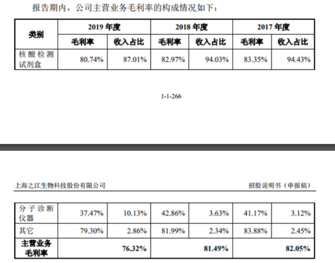 3个月的业绩已经快赶上之江生物此前两年的净利润。2017年、2018年、2019年之江生物的营业收入分别为1.9亿元、2.24亿元、2.58亿元,归属于母公司所有者的净利润分别为5153万元、6231万元、5152万元。5月22日,之江生物新冠病毒核酸检测试剂被列入WHO应急使用清单(EUL),可为 WHO成员国和各意向采购方提供采购依据。同时先后通过欧盟 CE 认 证,澳大利亚、南非、菲律宾、印度、 马来西亚、新加坡等国际认证,旗下新冠病毒核酸检测试剂盒和仪器设备销往全球 40 多个国家和地区。销量扩大的背后,之江生物核酸检测试剂盒产品的毛利率超过80%。数据显示,在2017年度至2019年度,之江生物核酸检测试剂盒的毛利率分别为83.35%、82.97%、80.74%。
