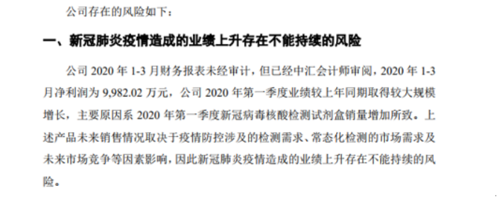作为第一个拿到新冠病毒核酸检测试剂盒注册证的企业,其销量也是备受关注,根据之江生物招股书披露,公司1月26日成为国内首批获得新冠病毒核酸检测试剂注册证的企业且取得了第一张注册证书,并快速量产;2月26日,公司新冠病毒核酸检测试剂成为国内较早获得欧盟CE认证的产品。因为一季度新冠病毒核酸检测试剂盒销量增加,之江生物第一季度业绩较上年同比有了大规模增长,净利润达到了9982.02万元。