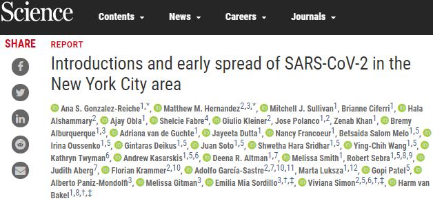 | 随着新冠肺炎(COVID-19)的进一步蔓延,全球超过650万人感染了新型冠状病毒(SARS-CoV-2),其中美国疫情最为严重,确诊病例数超过190万例,而作为美国疫情震中的纽约州,确诊病例数也已超过37万例。4月初,《纽约时报》在一篇报道中提到,美国两所高校正在进行的研究表明纽约州的新冠疫情主要起源于欧洲。如今,其中一所高校的研究报告已经出炉,为揭示SARS-CoV-2早期的全球传播动态提供了进一步支持。西奈山伊坎医学院的一支研究团队在对西奈山医院早期收治的84名COVID-19患者进行病毒测序后发现,这些病毒毒株主要是从欧洲和美国其他地方引入,并且早在3月初病毒已经进入了社区传播阶段。相关报告近日发表在《Science》上。  DOI:10.1126 /science.abc19172月29日,纽约州发现了首例COVID-19病例。截至3月18日,共有84名COVID-19患者前往西奈山医院就诊,其中44人为女性患者,40人为男性患者,他们来自纽约市四个大区和纽约州的三个县。研究人员从这些患者的鼻咽拭子中获取了90个病毒分离株并对其进行了测序,得到了72个完整的和18个部分的基因组。为了追溯纽约州疫情的早期发展,研究人员从全球流感数据共享平台(GISAID)下载了截至4月1日世界各地上传的2,363个SARS-CoV-2病毒序列,将其连同从84名患者身上获取的病毒序列进行了系统发育分析。系统发育树显示,纽约的84个病毒分离株可分为A1a、A2a、B、B1、B4这5个亚型,其中64个病毒分离株聚集在A2a类,该类主要由来自欧洲COVID-19患者的分离株组成,说明纽约州早期的COVID-19病例大多为欧洲引入。 纽约州和全球其他地区SARS-CoV-2分离株的系统发生关系随后,研究人员分析了与纽约市相关的病毒传播事件的时间,发现A2a进化树底部的最早序列包括自2月下旬开始来自意大利、芬兰、西班牙、法国、英国和其他欧洲国家的病毒分离株,以及从3月第一周开始的一些北美分离株。在这个分类中存在着两个突变,将纽约和其他地区的分离株区分开来,这说明可能在2月初到2月中旬当地至少引入了两个独立的病毒株。总之,这项研究表明,纽约州当地的新冠疫情主要来自美国和欧洲之间的无追踪传播,仅有有限证据显示该病原是从中国直接引入的,不仅为全球范围内SARS-CoV-2的多样性提供了快照,也为地方一级流行病动态提供了参考。[1] Introductions and early spread of SARS-CoV-2 in the New York City area. [2] Study shows NYC COVID-19 outbreak had European and U.S. origins. |