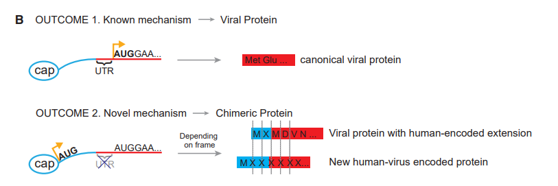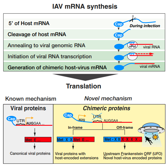 ▎药明康德内容团队编辑 今日,顶尖学术期刊《细胞》在线发表了一篇关于病毒的最新论文,揭示了病毒的一个全新特性:一支跨国科研团队发现,病毒会把自己的基因与人类基因拼接在一起,产生同时带有病毒和人类遗传信息的未知融合蛋白! 严格来说,病毒基因与人类基因发生融合,并不是一件新鲜事。毕竟病毒没有细胞结构,无法合成自己复制所需的蛋白质。因此,它们必须利用宿主细胞自带的系统来生产蛋白。而它们的做法,就是将自己的mRNA与宿主的mRNA进行融合。关于这一套流程,科学家们已经研究得比较透彻了。以流感病毒为例,通过一种叫做“cap-snatching”的方法,它能从宿主的mRNA处“抢夺下”5′端的帽状结构,贴在自己的mRNA前。这样,病毒就能欺骗细胞,让它们生产病毒的关键蛋白。 ▲Cap-snatching的分子机制(图片来源:参考资料[1])几十年来,人们一直以为,这种宿主-病毒融合的mRNA,只会翻译出属于病毒的蛋白质。而前面来自宿主的那一部分遗传信息,起到的更多是结构上的作用。研究人员们发现,病毒抢夺过来的,不止是宿主mRNA的5′端帽状结构,还会包括其启动密码子。这一过程也被叫做“start snatching”。因此,细胞的蛋白生产系统,完全有可能从宿主的启动密码子开始翻译。这样一来,整个翻译产生的蛋白质就全乱套了。 ▲一旦从宿主的启动密码子开始翻译,就会产生未知的蛋白(图片来源:参考资料[1])本研究也证实了这一点。在被流感病毒感染的细胞中,就出现了非常复杂的蛋白翻译情况。研究人员们总结指出,要么在病毒蛋白质的N端前多了一段原本不会被翻译的序列,要么产生了完全在意料之外的全新多肽。更有意思的是,这些新产生的融合蛋白还能诱导T细胞的反应,可能也与病毒的毒力(virulence)有关。这种情况可能并不仅限于流感病毒。研究人员们指出,在其他多种人类病毒、动物病毒、甚至植物病毒中,都可能存在这样的现象。 “为了理解病原体如何对抗宿主,产生感染能力,我们需要清楚地了解病原体会生成哪些蛋白质,它们有什么样的功能,以及它们对毒力的贡献如何。”本研究的通讯作者之一Ivan Marazzi教授说道。“病毒在分子层面上会控制其宿主。本研究发现了一种全新的控制方法,一些病毒会想尽办法去榨干(宿主内)分子机器的全部潜力。我们的研究集中在流感病毒上,但结果暗示,很多种类的病毒都有可能产生原先未知的基因。”本研究的另一名通讯作者Ed Hutchinson教授补充说道。参考资料: [1] Jessica Sook Yuin Ho et al., (2020), Hybrid Gene Origination Creates Human-Virus Chimeric Proteins during Infection, Cell, DOI:https://doi.org/10.1016/j.cell.2020.05.035 [2] Viruses Can Steal Our Genetic Code to Create New Human-Virus Genes, Retrieved June 18, 2020, from https://www.mountsinai.org/about/newsroom/2020/viruses-can-steal-our-genetic-code-to-create-new-human-virus-genes-pr |