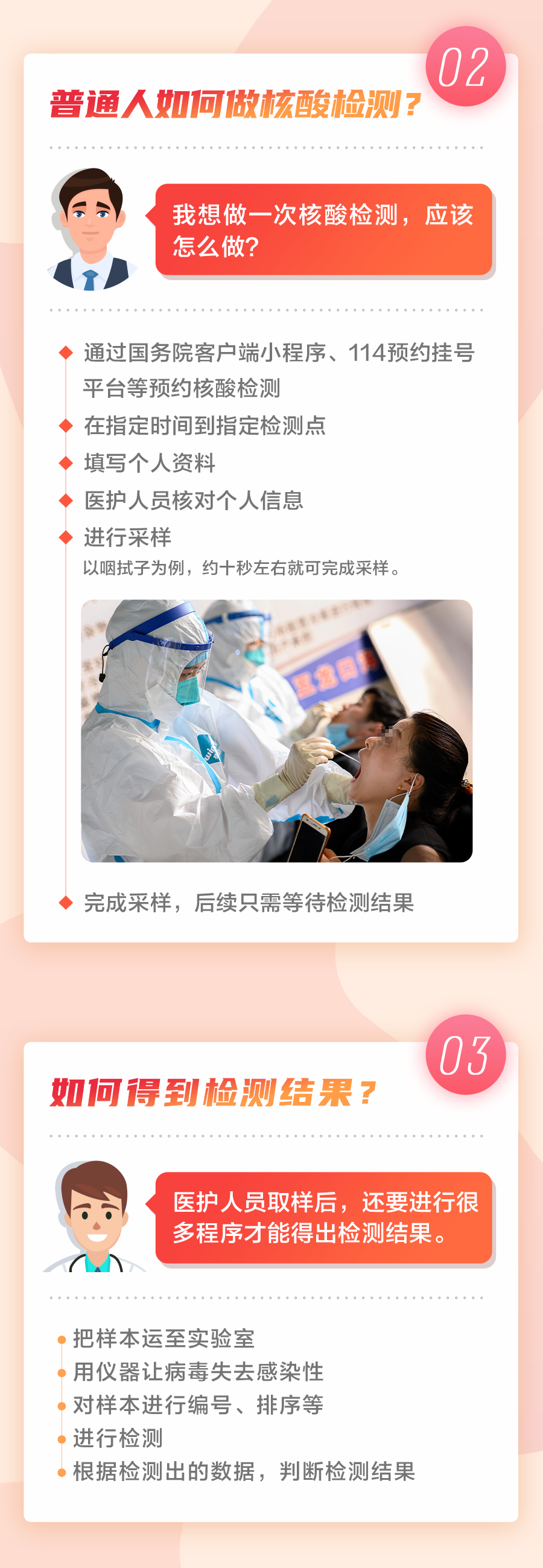 | 近日,北京迅速扩大增强检测力量,日核酸检测能力已提升至30万份以上。一份核酸检测不仅能让人安心,也能有效阻断疫情传播。那核酸检测怎么做?哪些人群需要测?检测结果迟迟不出,是否意味着情况不妙?一起看图,了解核酸检测那些事↓↓↓