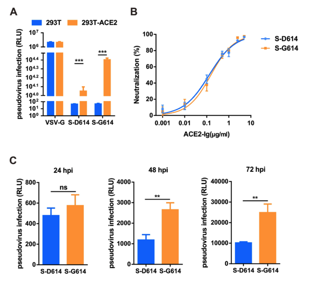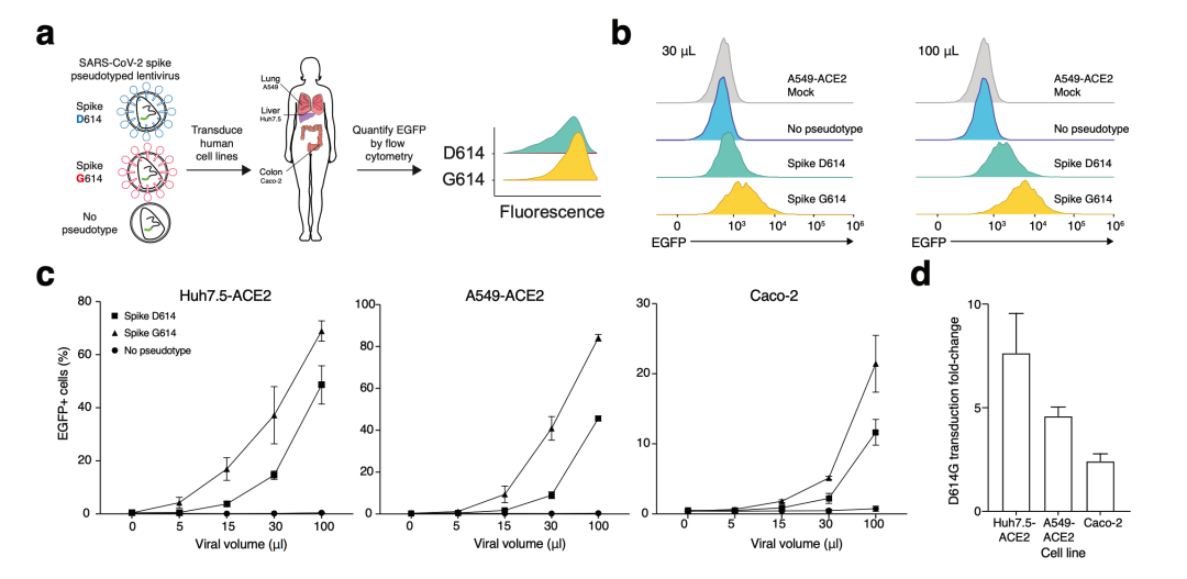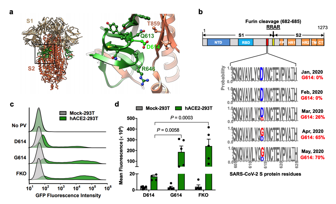 这种较大的感染力与S1脱落较少和S蛋白更多地融入伪病毒体有关。使用SARS-CoV-2 M、N、E和S蛋白产生的病毒样颗粒也得到了类似的结果。然而,SG614与ACE2的结合效率并不比SD614高,含有这些S蛋白的伪病毒被康复期血浆中和的效率相当。这些结果表明SG614比SD614更稳定,与流行病学数据一致,表明带有SG614的病毒传播效率更高。 D614G突变,bioRxiv preprint doi: https://doi.org/10.1101/2020.06.12.148726需要指出的是,该研究是使用制造关键冠状病毒蛋白的无害病毒进行的,研究观察到的变化是否还能转化为现实世界中传播能力的提高,还需要进行更多的流行病学研究。The D614G mutation in SARS-CoV-2 Spike increases transduction of multiple human cell types,bioRxiv preprint doi: https://doi.org/10.1101/2020.06.14.1513576月15日,纽约基因组研究中心Neville E. Sanjana团队基于伪病毒和人肺上皮细胞等细胞系,再次发现D614G变异让伪病毒感染细胞的能力提升2.4-7.7倍,其中感染人肝细胞(Huh7.5-ACE2)最为显著。来自美国这些研究表明,这一新冠病毒变种与此前中国武汉发现的病毒不同(没有这种刺突蛋白突变),这或许可以解释为什么新冠病毒能够在欧洲、北美和拉丁美洲更广泛地传播。但也有其他科学家警告称,要确定病毒差异是否影响爆发过程的因素,还需要进行大量研究。其他因素显然也影响了这一传播,包括封城时间、出行、社交方式和运气等。D614G流行变异情况,The D614G mutation of SARS-CoV-2 spike protein enhances viral infectivity and decreases neutralization sensitivity to individual convalescent sera,doi: https://doi.org/10.1101/2020.06.20.1613236月20日,重庆医科大学黄爱龙教授团队在预印本网站Biorxiv发表研究称,新冠病毒刺突S蛋白D614G氨基酸残基的突变可显著增强病毒的感染能力,并且能够降低对个体恢复期血清的敏感性。这项研究再次证实美国斯克里普斯研究所等机构对出现在S蛋白中的D614G变异做了初步研究,发现新冠病毒S蛋白的D614G变异会提升新冠病毒感染细胞的能力。文章指出,介导SARS-CoV-2进入宿主细胞的刺突蛋白是疫苗和治疗剂的主要靶标之一。因此,深入了解S蛋白的序列变异是了解SARS-CoV-2的感染和抗原性的关键。黄爱龙教授团队观察到了S蛋白在614位的显性突变(天冬氨酸对甘氨酸,D614G突变)。使用基于伪病毒的分析,发现S-D614和S-G614蛋白假型病毒共享一个共同的受体,即人血管紧张素转换酶2(ACE2),该重组受体可以被重组ACE2与人IgG1融合的Fc区阻断。但是,S-D614和S-G614蛋白表现出功能差异。首先,S-G614蛋白可以更有效地被丝氨酸蛋白酶elastase-2裂解,其次,S-G614伪病毒感染的293T-ACE2细胞比S-D614伪病毒更有效。S-G614蛋白伪病毒显示出更强的感染力,The D614G mutation of SARS-CoV-2 spike protein enhances viral infectivity and decreases neutralization sensitivity to individual convalescent sera,doi: https://doi.org/10.1101/2020.06.20.161323