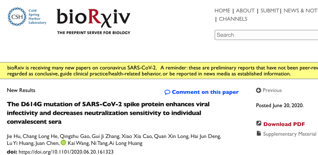 文章指出,迫切需要确定这种称为D614G的突变会对从未有相关突变病毒中恢复的人们造成何种威胁。同样令人担忧的是,对于以前感染了较温和毒株且已经康复的患者,新毒株实际可能导至第二次感染,但尚无临床证据。他们的研究发现来自恢复期COVID-19患者的93%(38/41)血清可以中和S-D614和S-G614伪型病毒具有相当的效率,但约7%(3/41)的恢复期血清显示出对S-G614假病毒的中和活性降低。这些发现对SARS-CoV-2传播和免疫干预具有重要意义。黄爱龙教授团队指出,鉴于SARS-CoV-2 RNA基因组的进化性质,可能需要进一步考虑抗体治疗和疫苗设计,以适应D614G和其他可能影响病毒免疫原性的突变。Spike mutation pipeline reveals the emergence of a more transmissible form of SARS-CoV-2,bioRxiv preprint doi: https://doi.org/10.1101/2020.04.29.069054今年4月份,IBM AI医疗团队在四月份的一项研究中警告称,D614G突变可能会降低针对该病毒刺突蛋白的疫苗计划有效性。5月,洛斯阿拉莫斯(Los Alamos)国家实验室的研究员贝特·科伯(Bette Korber)发表论文指出,欧洲和美国东海岸流行的是一种新型突变体病毒,其传播力更强。科学家开始将注意力集中在D614G突变上。另外塞尔维亚一项研究中得出类似的结论。但综合多项研究来看,新冠病毒基因序列23403位点从A(腺嘌呤)突变成了G(鸟嘌呤)导至的D614G突变,相应的棘状蛋白的第614个氨基酸从D变成了G D614G突变使病毒的棘状蛋白增加4-5倍,并使这些蛋白更稳定、进而使病毒更容易侵入人体细胞,实验室环境下可达9倍效率,D614G突变在现实环境下对新冠病毒感染力的影响仍待研究。北京疫情病毒突变属于D614G变异,并已有多地报告北京相关病例,诸如天津市疾控中心对天津第137例确诊病例呼吸道标本的新冠病毒全基因组高通量测序和序列分析,并由中国疾控中心复核,确认与北京新发地市场相关病例的病毒序列完全相同,属于L基因型欧洲家系分支I。这可能给防疫带来困难。目前,北京市正加快储备和加强北京核酸检测的力量,以进一步扩大核酸检测范围,湖北、辽宁等多地也开始援助北京,以提升其检测能力,并有强化社区管控趋势。