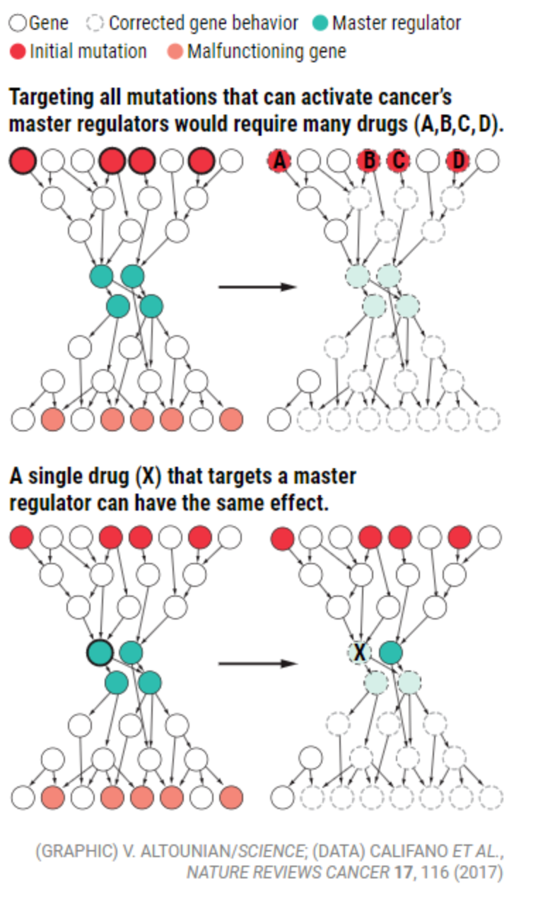 2016年,医生邀请Eileen Kapotes参加一个用于她的病症的新药的临床试验,当时Kapotes是50多岁的一级老教师,她正在与已经扩散到全身的恶性乳腺癌作斗争。在过去的四年中,她尝试了许多艰苦的治疗,包括全脑放射治疗,她还一直在服用乳腺癌药物Herceptin,但她的肿瘤仍在增长。现在,她有机会尝试一种截然不同的方法:一种名为ruxolitinib的药物,最初旨在治疗血液和骨髓相关的癌症。Kapotes的肿瘤主治医生,西奈山医院的Amy Tiersten对她的病人对新药的反应情况感到惊讶。它阻止了她的癌症继续恶化,而且她几乎没有副作用。ruxolitinib试验是哥伦比亚大学系统生物学家Andrea Califano历时十年的追求的产物。通过复杂的计算,他对催化癌细胞的分子网络进行建模,并精确定位到转录因子蛋白作为关键因子,从而控制细胞内许多基因表达。Califano与当时也是哥伦比亚大学的细胞生物学家JoséSilva合作,在对Herceptin产生耐药性的患者群体的组织库中选取分析了他们乳腺癌样本。分析结果表明,一种叫做STAT3的转录因子在那些癌症中起着至关重要的作用。并且已知ruxolitinib抑制STAT3。一些研究人员专注于找寻能够导至个体疾病的基因突变。因为人们认为,这样做可以帮助为每个患者确定最佳的靶向药物。但是由于人群中致癌基因突变的多样性,那就可能需要成千上万种药物来治疗不同的人。相比之下,Califano的做法与上述方式有所不同。相反,他专注于识别少数充当瓶颈的转录因子。Califano认为,无论最初由何种基因突变导至癌变,通过靶向那些主要的基因调控过程,我们都可以阻止癌症。肿瘤学家仍将需要分析每个患者的基因突变,以确定哪些调控因子会在特定的癌症中起作用,但Califano说,他们不需要成千上万种药物来针对不同基因突变,而只需要几十种。这是个体化医疗中的非个性化方法。该策略启发于Califano作为物理学家的计算能力上,他说:“我们已经建立了可以对每种不同肿瘤的逻辑进行逆向推断的算法,以便我们找到药物的靶标。” 他的算法是系统生物学的一个典型例子,它使用复杂的数学模型来模拟复杂的生物系统,例如基因相互作用。这个领域引起了研究者极大的兴趣,但是在现实中却很少取得临床成就。哥伦比亚大学捐助1500万美元,代码真的能治疗癌症?2015年,Califano与他人共同创立了一家名为DarwinHealth的公司,该公司利用他的算法通过识别患者肿瘤中的关键转录因子并选取合适的靶向药物来指导医生。他的工作赢得了其他研究人员的称赞,尽管有人指出这种方法仅在人体测试的早期阶段,且其临床用途仍不确定。非营利性生物医学研究所Jackson Laboratory的总裁兼首席执行官Ed Liu乐观地认为这种方法终将会获得回报。“随着我们开发出越来越精确的方法来针对靶点,他的算法将变得越来越有用”。Califano的方法即将迎来一次它最大的考验。哥伦比亚大学已拨款1500万美元,用于在未来3年内对其医院中的3000名癌症患者进行试验,并使用DarwinHealth算法分析每个患者的癌症并推荐个性化治疗方法。“这可能是我研究中最激动人心的时刻之一,” Califano说,“因为它使我们最终能够在足够大的规模中应用这种方法,从而能够从患者的药物反应中真正的得到一些有用的数据和信息”。如果向癌细胞突变位点在整个调控网络中定位太靠近上游,那么关闭故障基因将是一项艰巨的任务。但是,对于细胞遗传电路中作为主要调控因子的转录因子来说,仅使用一种药物抑制它也将会导至癌变机制崩溃。针对所有可能激活癌症主要调控因子的突变,将需要许多药物(A,B,C,D)。单一药物(X)用于靶向关键调控因子就可以达到相同的效果。1958年秋天,一位名叫François Jacob的年轻科学家来到巴黎巴斯德研究所和他的同事Jacques Monod,提出了关于遗传机制如何控制细胞行为的假说。这两个人都有叛逆的性格倾向:在第二次世界大战中,Jacob代表流亡的法国政府与纳粹战斗导至受伤,而经验丰富的攀岩者Monod参加了法国抵抗运动的游击活动。在接下来的几年中,两人一起工作,他们是第一个揭示遗传通路想法的人。这项工作使他们获得了1965年诺贝尔生理学和医学奖。在大肠杆菌实验中,Jacob和Monod发现,取决于可利用的食物类型,这些细菌中的基因网络可以改变某些酶的产生。当糖乳糖丰富时,细菌会打开编码该酶的基因来使其代谢。但是外界只能获取葡萄糖(另外一种糖),微生物关闭了编码该酶的基因。这是一个开创性的发现,即单个基因的表达活性可以(通过调控)被增强或者抑制。随后几十年的实验帮助揭示了如何发挥这种控制作用的细胞机制。一个关键因素是转录因子,是一种增强或抑制其他基因活性的蛋白质。单个细胞的基因调控网络要比Jacob和Monod所揭示的(大肠杆菌中的调控网络)要复杂得多。人类基因组包含20,000个基因,其中大约有1500个产生转录因子。这些基因构建的系统组成了一个包含开关基因的复杂调控网络。Califano认为,如果他能够确定癌症的关键开关,那么他也许能够关闭驱动其灾难性增值的遗传突变基因。在1986年完成物理学家培训后,IBM招募了他参与计算机视觉和人工智能领域的前沿项目。但是IBM设施的建筑规范使Califano无法建立实验室来满足他对生物学的研究兴趣。于是他在2000年离开,并于2003年去到哥伦比亚。在他到达的那一天,他开始编写代码来解决癌症难题。如今,他算