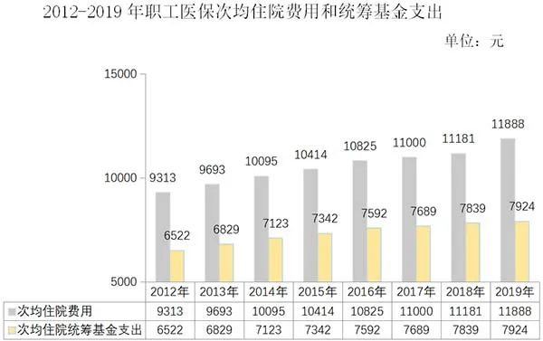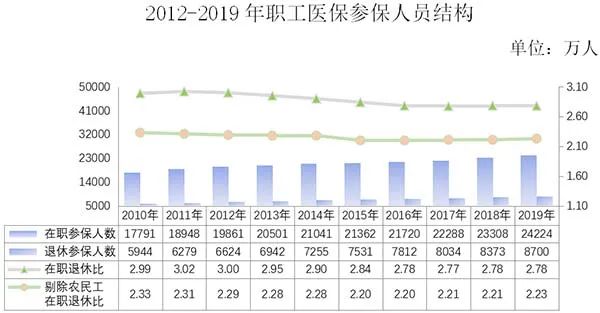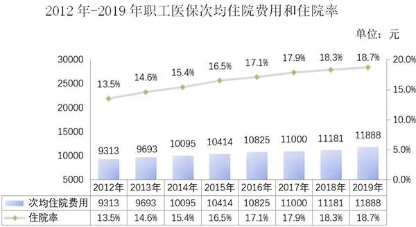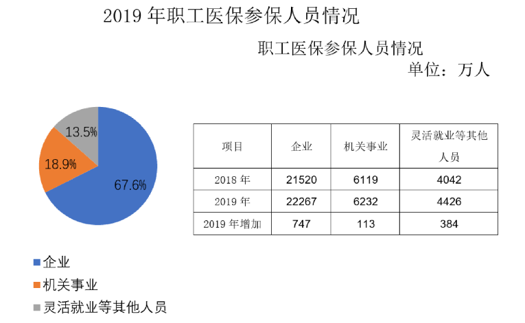 2019年,全国医疗保障系统坚持以习近平新时代中国特色社会主义思想为指导,全面贯彻落实党的十九大和十九届二中、三中、四中全会精神以及中央经济工作会议精神,按照党中央、国务院决策部署,牢记初心使命,坚持以人民为中心的发展思想,坚持稳中求进工作总基调,锐意改革,攻坚克难,推动医疗保障领域各项制度完善、政策到位,医疗保障工作取得了新的成绩。 01 医疗保险 2019年参加全国基本医疗保险[1](以下简称基本医保)135407万人,参保率稳定在95%以上。2019年,全国基本医保基金(含生育保险)总收入24421亿元,比上年增长10.2%[2],占当年GDP比重约为2.5%;全国基本医保基金(含生育保险)总支出20854亿元,比上年增长12.2%,占当年GDP比重约为2.1%;全国基本医保基金(含生育保险)累计结存[3]27697亿元,其中基本医保统筹基金(含生育保险)累计结存[4]19270亿元,职工基本医疗保险(以下简称职工医保)个人账户累计结存8426亿元。 (一)职工基本医疗保险 1、参保人数持续增加。参加职工医保32925万人,比上年增加1244万人,增长3.9%。其中在职职工24224万人,比上年增长3.9%;退休职工8700万人,比上年增长3.9%。在职退休比为2.78,同比持平。 企业、机关事业、灵活就业等其他人员这三类参保人(包括在职职工和退休人员)分别为22267万人、6232万人、4426万人,分别比上年增加747万人、113万人、384万人,分别占参保总人数的67.6%、18.9%和13.4%,构成比例与上年基本一致。职工医保统账结合和单建统筹参保人员分别为30235万人、2690万人,分别占职工医保参保总人数的91.8%和8.2%。 2、基金收支规模扩大。2019年,职工医保基金(含生育保险)收入15845亿元,比上年增长10.7%;基金(含生育保险)支出12663亿元,比上年增长10.4%。2019年,职工医保统筹基金(含生育保险)收入10005亿元,比上年增长10.9%;统筹基金(含生育保险)支出7939亿元,比上年增长9.4%;统筹基金(含生育保险)当期结存2066亿元,累计结存(含生育保险)14128亿元。2019年,职工医保个人账户收入5840亿元,比上年增长10.3%;个人账户支出4724亿元,比上年增长12.2%;个人账户当期结存1116亿元,累计结存8426亿元。 3、享受待遇人次增加。2019年参加职工医保人员享受待遇21.2亿人次,比上年增长7.3%,增幅下降1.7个百分点。其中:普通门急诊18.1亿人次,比上年增长5.8%;门诊慢特病2.6亿人次,比上年增长19.4%;住院0.6亿人次,比上年增长6.8%。 2019年,职工医保参保人员人均就诊6.4次,比上年增加0.2次;住院率18.7%,比上年提高0.4个百分点。其中:在职职工住院率为10.1%,比上年提高0.4个百分点;退休人员住院率为42.5%,比上年提高0.4个百分点。 4、次均住院费用持续增长。2019年,全国职工医保次均住院费用为11888元,比上年增长6.3%。 5、住院报销水平稳中略升。职工医保政策范围内住院费用基金支付85.8%[5],实际住院费用基金支付75.6%,个人负担24.4%。二级、一级以下医疗机构政策范围内住院费用基金支付分别为87.2%、89.3%,分别高于三级医疗机构2.2个、4.3个百分点。 2019年职工医保参保人员医疗总费用14001亿元[6],比上年增长15.3%,其中医疗机构发生费用11971亿元,个人账户在药店支出费用2029亿元。医疗机构发生费用中,退休人员医疗费用7054亿元,比上年增长12.8%;在职职工医疗费用4918亿元,比上年增长16.0%;人均医疗费用3723元,比上年增长12.4%。 (二)城乡居民基本医疗保险[7] 1、参保人数持续增加。2019年,参加全国城乡居民基本医疗保险(以下简称居民医保)102483万人,比上年减少0.3%[8]。其中成年人、中小学生儿童、大学生分别为76942万人、23519万人、2022万人,分别比上年增长16.1%、10.1%、-2.9%,分别占参保总人数的75.1%、22.9%、2.0%。 2、基金收支规模不断扩大。2019年,居民医保基金收入8575亿元,支出8191亿元,分别比上年增长