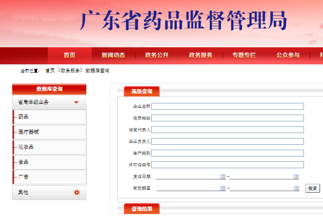 查询路径:进入广东药监局官网主页,找到数据查询界面