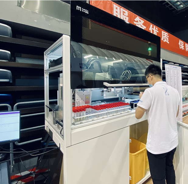火眼实验室人员操作MGISP-960 图片来源:新华社 拍摄地点:北京,大兴火眼实验室 但随着自动化提取能力的提升,在自动化核酸提取的前一步:转板(把样本从采集管移至自动化核酸提取仪的上样板,用于下一工序的核酸提取),又成为了新的限速步骤。这一步骤包括对样本采集管的开盖、移液和关盖,还包括对样本信息进行人工扫码和核对,这些琐碎的操作非常费时,也很容易出错。 为进一步加快样本前处理的速度,华大智造已紧急研发全自动MGISTP-7000分杯处理系统,并将其在第一时间送抵了北京大兴火眼实验室,为进一步提升核酸检测能力提供储备力量。 华大智造技术人员调试 全自动MGISTP-7000分杯处理系统 图片来源:华大智造 拍摄地点:北京,大兴火眼实验室 较之手动整理样本采集管并进行人工分装的工作模式,全自动MGISTP-7000分杯处理系统将大量需要人工操作的前处理步骤整合到一个封闭系统中,内设独立双通道移液模块,有效移液范围10-1000uL,可在40分钟内实现192例样本从单管到96孔板的快速精准分装,大大节省了人力成本,同时减少了实验室空间压力,而且最重要的是有助于检测能力的大幅提升。 MGISTP-7000支持灭活后的样本采集管“原管带盖上样”,支持自动化开盖和关盖、自动化条码信息录入,同时内置负压过滤系统,安全可靠。 以日通量为1万例样本的核酸检测实验室为例,且所有实验室人员均支持两班倒的工作模式下:如果只有自动化核酸提取仪和荧光定量PCR仪,则至少需要4台生物安全柜用于样本采集管的存放和分装,14名熟练掌握分装技巧的实验员,24小时人工值守,从分装到提取到RT-PCR上机,尤其是分装环节需要100%人工操作;如果在此基础上,增加1-2台全自动MGISTP-7000分杯处理系统,则只需2名初级实验员,将样本采集管放入该系统中,即可完成上样和分装,样本管进、样本板出,直接进入下一个自动化工作流——自动化核酸提取,省时省力,还能避免操作人员和新冠样本的接触,大大降低了出错概率和生物风险。 在这场没有硝烟的战争中,越来越多的生物企业拿起武器、参与其中,不遗余力,与疫情抗争到底。在这场与时间赛跑的战争中,快速响应能力、及时交付能力和雄厚的研发能力、创新能力,让中国生物企业成为全球的标杆。 从华大智造最新研发的全自动MGISTP-7000分杯处理系统,到其独具优势的自动化核酸提取设备MGISP-960,再到常见的:荧光定量PCR仪,这些看似普通的自动化设备和检测仪器,在新冠核酸检测大军中发挥着不可替代的作用。 |