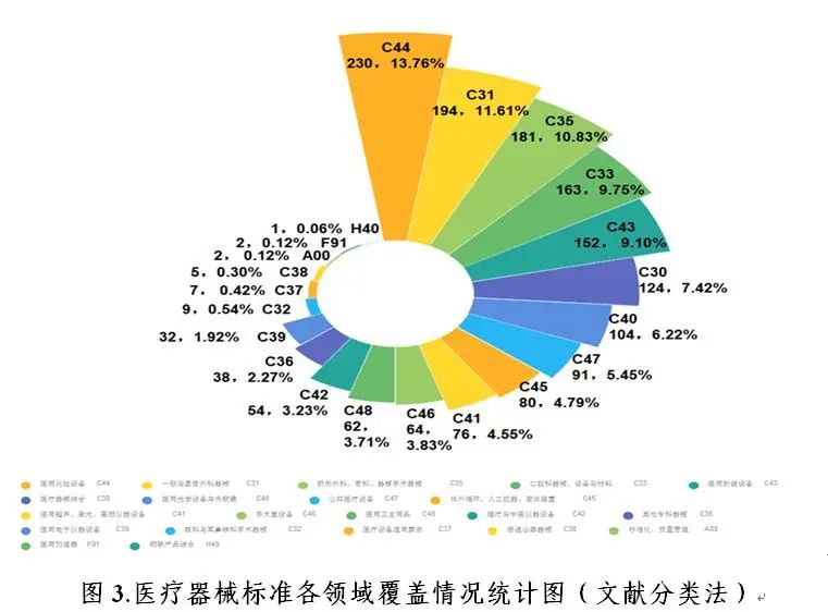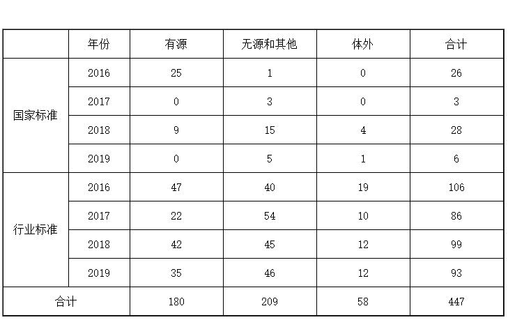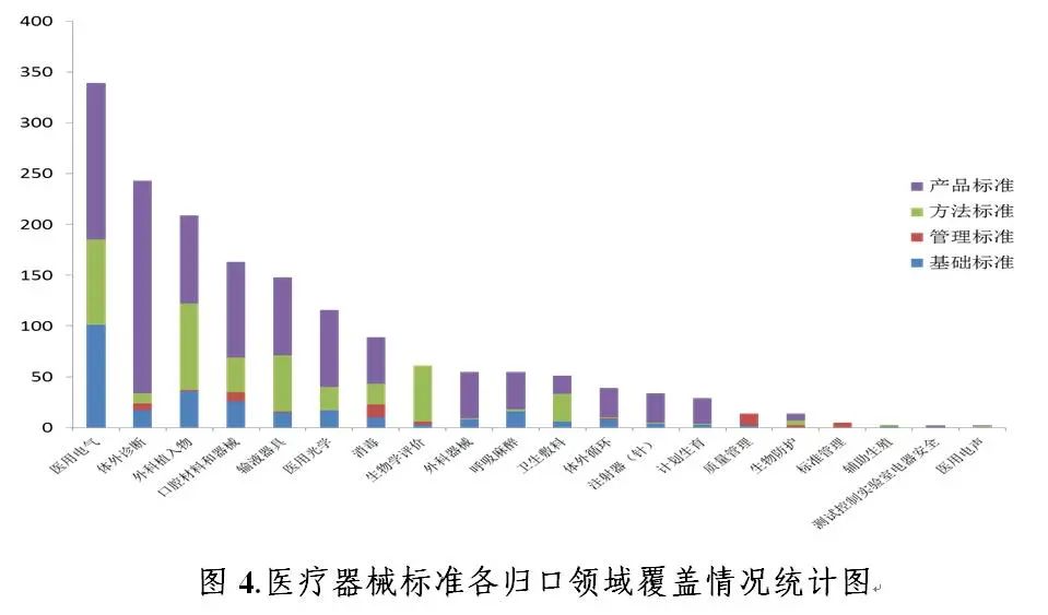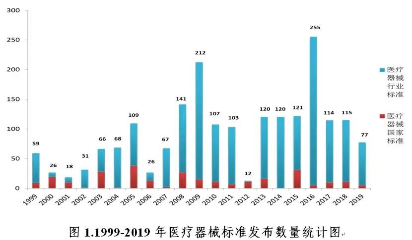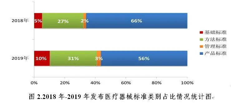▲中国医疗器械标准年报(2019年度)(来源:中检院)2019年,国家药品监督管理局坚持以习近平新时代中国特色社会主义思想为指导,严格落实习近平总书记“最严谨的标准”要求,坚定保安全底线、追发展高线两个目标,围绕医疗器械科学监管大局,把好方向守初心、聚力前行担使命,从体系机制建设完善和业务工作规范两方面入手,扎实有序推进医疗器械标准体系建设。 为贯彻落实“十三五”国家药品安全规划(以下简称“十三五”规划)每年完成约100项医疗器械标准制修订任务,国家药品监督管理局按照《医疗器械标准管理办法》和《医疗器械标准制修订工作管理规范》有关要求,组织、指导医疗器械标准化(分)技术委员会或技术归口单位[以下统称“标委会(技术归口单位)”]按时保质完成标准制修订任务。截至2019年底,“十三五”规划中500项医疗器械标准制修订任务已立项447项,已完成89.4%(表1)。2019年共发布国家标准5项、行业标准72项以及行业标准修改单3项,医疗器械标准共计1671项(表2),医疗器械标准技术体系持续优化。▲表1-十三五”医疗器械标准制修订情况统计表(单位:项;来源:中检院)▲表2-医疗器械标准情况统计表(单位:项;来源:中检院)(一)标准数量稳步增长。“十五”“十一五”和“十二五”期间分别发布医疗器械标准292项、553项和476项。“十三五”即将收官,截至2019年底,已发布医疗器械标准共561项,自1999年-2019年20年来医疗器械标准发布数量稳步增长(图1)。经历了起步发展期和高速度增长期后,医疗器械标准技术体系从体量上已基本满足监管和产业发展需求,随着科技进步、产业发展和监管理念的转变,医疗器械标准已走上质量效率并重的集约型发展道路。(二)标准类别更加合理。截至2019年底,现行有效医疗器械标准中有基础标准273项、管理标准54项、方法标准406项、产品标准938项(表3)。▲表3-医疗器械标准规范对象划分情况统计表(单位:项;来源:中检院)2018年以来,医疗器械标准确立了基础通用、采用国际标准及监管急需标准优先立项的原则,从立项源头逐步优化医疗器械标准体系。2019年发布的77项标准中,基础标准8项、管理标准2项、方法标准24项、产品标准43项,基础标准占全年发布标准总数的10%,产品标准占比由上一年度的66%降低到56%,医疗器械标准体系结构组成更趋合理(图2)。(三)标准覆盖面更加全面。医疗器械标准基本覆盖医用电气设备、手术器械、外科植入物等医疗器械各技术领域。按照《中国标准文献分类法》,医疗器械标准主要归类在C30至C49之间,C10和C30代表医药和医疗器械综合,其他代号指代的领域多为具体的产品领域。从现有医疗器械标准领域分布情况看,占比前5位的分别是:医用化验设备(C44)13.8%,一般与显微外科器械(C31)11.6%,矫形外科、骨科器械(C35)10.8%,口腔科器械、设备与材料(C33)9.8%,医用射线设备(C43)9.1%(图3)。按照标委会(技术归口单位)归口领域,标准数量排名前5位的分别是:医用电气设备领域339项(20.3%),体外诊断领域243项(14.5%),外科植入物领域209项(12.5%),口腔材料和器械163项(9.8%)和输液器具领域148项(8.9%)。在各归口领域中,根据不同领域的标准需求,标准类别有所不同,医用电气设备、呼吸麻醉领域的基础标准占比较高,均达29.0%;医疗器械标准管理和质量管理领域的管理标准占比最高,分别为100%和85.7%;医疗器械生物学评价领域的方法标准占比最高,达90.2%;计划生育和体外诊断医疗器械领域的产品标准占比最高,分别为86.2%和86.0%(图4)。(四)标准约束力更加优化。截至2019年底,医疗器械强制性标准共395项,其中国家标准85项,行业标准310项。2019年国家药品监督管理局根据国务院强制性标准整合精简结论,发布《关于〈医用诊断X射线辐射防护器具 第1部分:材料衰减性能的测定〉等40项强制性医疗器械行业标准转化为推荐性行业标准的公告》(2019年第106号),转化为推荐性的40项标准中,产品标准23项(占57.5%),方法标准7项(占17.5%),管理标准1项(占2.5%),基础标准9项(占22.5%),医疗器械标准技术体系进一步优化。二、强化精细化管理,推动标准法规制度体系建设向纵深发展近年来,医疗器械标准相关法律法规相继制修订,基本建成了内容科学、程序严密、配套完备的医疗器械标准法规制度体系,形成了纵向维度效力层级明晰、横向维度主体范围明确的医疗器械标准法规制度体系。2019年针对标准制修订关键环节,结合工作实际,制定印发《医疗器械标准化工作档案管理要求》《医疗器械标准审核要点》《医疗器械标准化技术委员会考核评估细则》,修订了《医疗器械标准验证工作细则》《医疗器械标准报批材料审核工作流程》。在医疗器械标准法规体系的基础上进一步细化规范性要求(图5),推动医疗器械标准全过程精细化管理向纵深发展。标委会(技术归口单位)是医疗器械标准制修订的承担主体,也是医疗器械标准体系组织架构的重要组成部分。国家药品监督管理局认真贯彻落实国家加快发展战略性新兴产业的决定,积极推动在国家发展战略部署和监管亟需领域标准化发展,特别是新兴技术领域和医疗器械优势学科领域,按照《医疗器械标准管理办法》有关规定,筹建新兴领域标委会(技术归口单位)。2019年,全国外科植入物和矫形器械标准化技术委员会有源植入物分技术委员会(SAC/TC 110/SC4)和全国医疗器械生物学评价标准化技术委