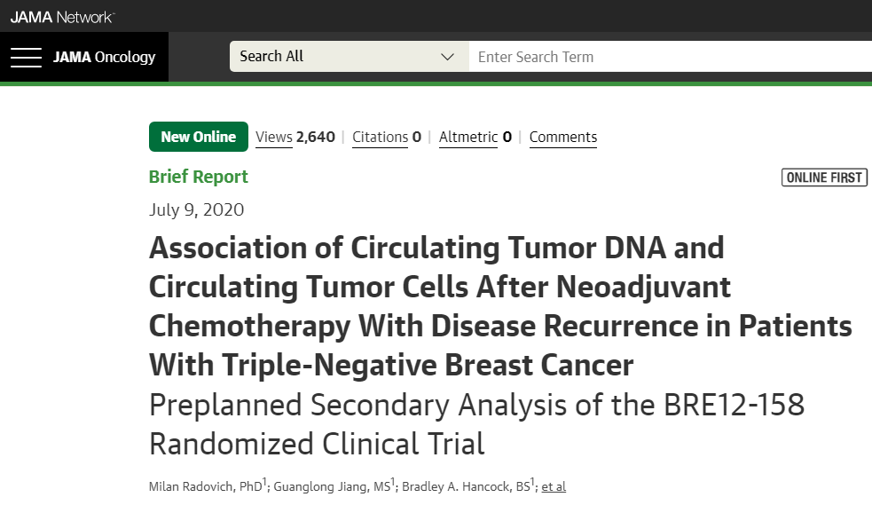 早期三阴性乳腺癌患者经常接受新辅助化疗,因为三阴性乳腺癌的复发和死亡风险较高。有一部分患者继续生存而没有复发,但有相当数量的患者在化疗后病情复发。基于血液的基因组检测,或液体活检,在TNBC和其他癌症患者中迅速流行起来,以确定哪些患者可能存在残留癌,哪些患者的预后可能会因新的或现有的治疗而得到改善。