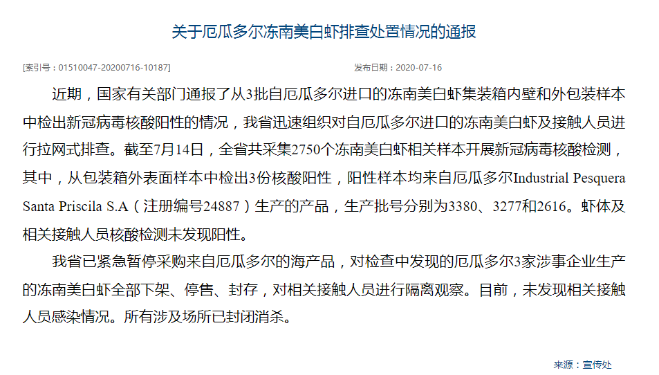 7月15日,重庆沙坪坝区新冠肺炎疫情防控工作领导小组发布通报称,7月14日,检测发现西部物流园一冷冻仓库部分厄瓜多尔冻南美白虾外包装新冠病毒核酸呈阳性。 沙坪坝区疫情防控工作领导小组第一时间对配送点、门店、消费者及相关接触人员进行全面排查,对物品进行封存,对接触人员进行隔离观察,并严格开展环境、物品和接触人员的核酸检测。 厄瓜多尔:已向中国保证履行程序 保证冻虾等出口产品安全性《环球时报》记者15日从厄瓜多尔驻华大使馆处了解到,就从该国进口的南美冻虾外包装上检测出新冠病毒一事,厄瓜多尔政府近期已同中国政府举行至少四次会见会谈,据该国外长路易斯•加耶戈斯称,厄方已向中国保证,将履行“必要程序”,以确保该国出口到国际市场的产品的安全性。 三部门已紧急通知:立即禁售厄瓜多尔冻南美白虾 早在7月10日,海关总署、国家卫健委、市场监管总局就已向全国各省、自治区、直辖市下发《关于对部分自厄瓜多尔进口冻南美白虾实施紧急处置的通知》,要求对部分自厄瓜多尔进口冻南美白虾实施紧急处置。 海关总署表示,对检出阳性的样本,经核酸序列分析并经专家研判,检测结果提示厄瓜多尔三家企业产品的集装箱环境、货物外包装存在被新冠病毒污染风险。专家研判认为,检出结果不代表具有传染性,但反映出相关企业的食品安全管理制度落实不到位。 多地拉响警报,紧急出手! 在浙江,截至7月11日上午,浙江省市场监管系统会同海关部门已对浙江省内进口商、经销商的77812.08千克自厄瓜多尔进口的冻南美白虾采取封存召回措施。 在广东,截至7月14日中午12点,广州、深圳、惠州、汕尾、湛江等5个市排查发现厄瓜多尔进口的涉事产品,停售、封存冻虾约82.3吨,针对性开展人员、产品、环境核酸检测共1041批次,结果均为阴性。 国家食品安全风险评估中心微生物实验室主任李凤琴此前表示,包括海鲜在内的所有的食物,它不会感染新型冠状病毒,但是可能存在着被新型冠状病毒污染的可能,目前还不能排除低温冷藏的食品和食品包装材料作为病毒的载体造成新型冠状病毒污染环境并引起人类传播的可能。 北京市疾控中心此前也给出建议,疫情期间应注意防范接触性传播: