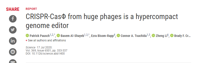| 基因编辑作为一种新兴的基因工程技术,其本质是人为地改变自然选择。目前广泛使用的“基因剪刀”是CRISPR-Cas9,该技术在一系列基因治疗的应用领域都展现出极大的应用前景,但过大的蛋白分子成为CRISPR未来应用方式中最重要的瓶颈之一。最近,来自美国加利福尼亚大学伯克利分校创新基因组学研究所的研究人员发现了一种新型基因编辑工具——CasΦ,它是一种功能最小的CRISPR-Cas系统,由1〜70 KD的CasΦ蛋白和一个CRISPR阵列组成,且仅在巨噬细胞的基因组中编码,其体积是CRISPR-Cas 9的一半,这项研究成果于7月16日发表在《Science》杂志上。