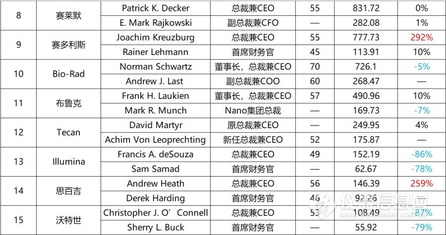 2019年度科学仪器CEO薪酬排行榜 图片来源:仪器信息网 2019年全球科学仪器市场面临重重挑战,榜单中7位仪器企业CEO的薪酬逆风飞扬,实现双位数增长;5位收入微增;另有3位薪酬下跌,其中Illmina、沃特世两家公司高管的收入跌幅超过80%。相比之下Illumina老板的日子似乎不太好过,消费者(DTC)业务疲软,收购PacBio计划落空,多重打击让Illmina高管蒙受损失,首席运营官Omead Ostadan也于近日离开公司。